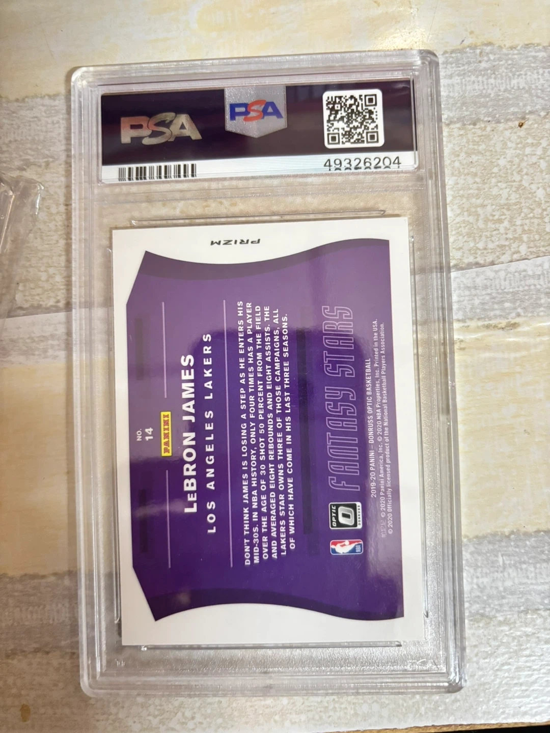 This is a 2019 Panini Donruss Optic card featuring LeBron James. It's part of the Fantasy Stars set and is a purple parallel. The card is graded GEM MT 10 by PSA. It's a highly collectible item for basketball fans.