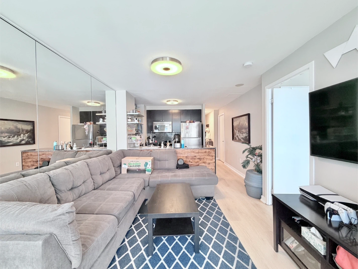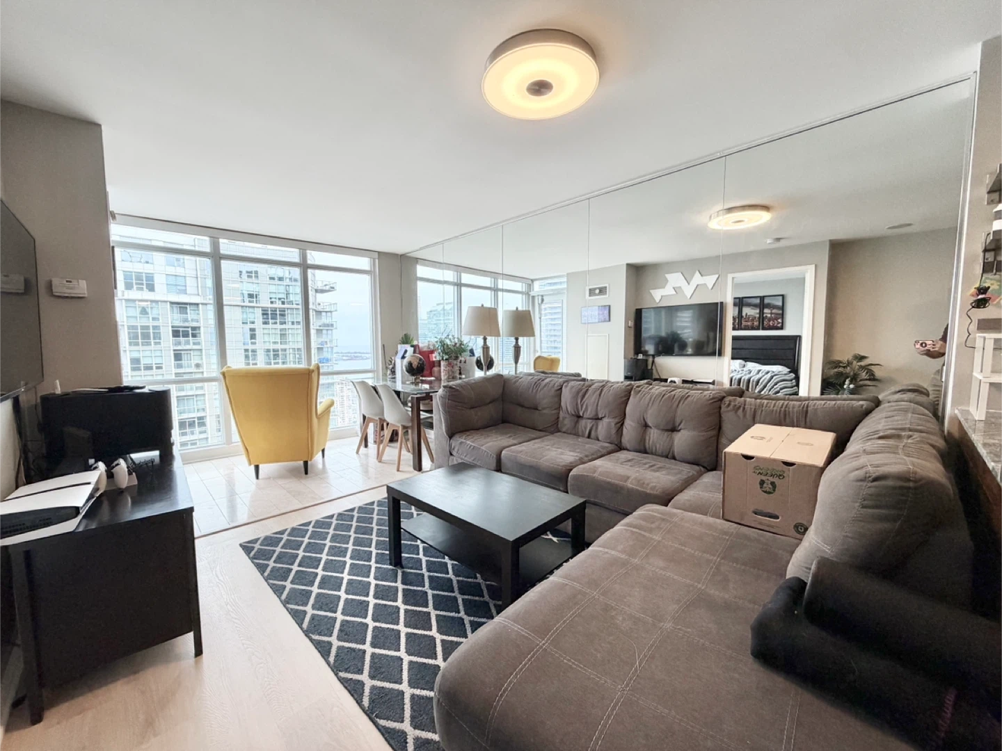 Large grey sectional sofa with a chaise lounge. Upholstered in a durable fabric. Plenty of seating space for your living room!
