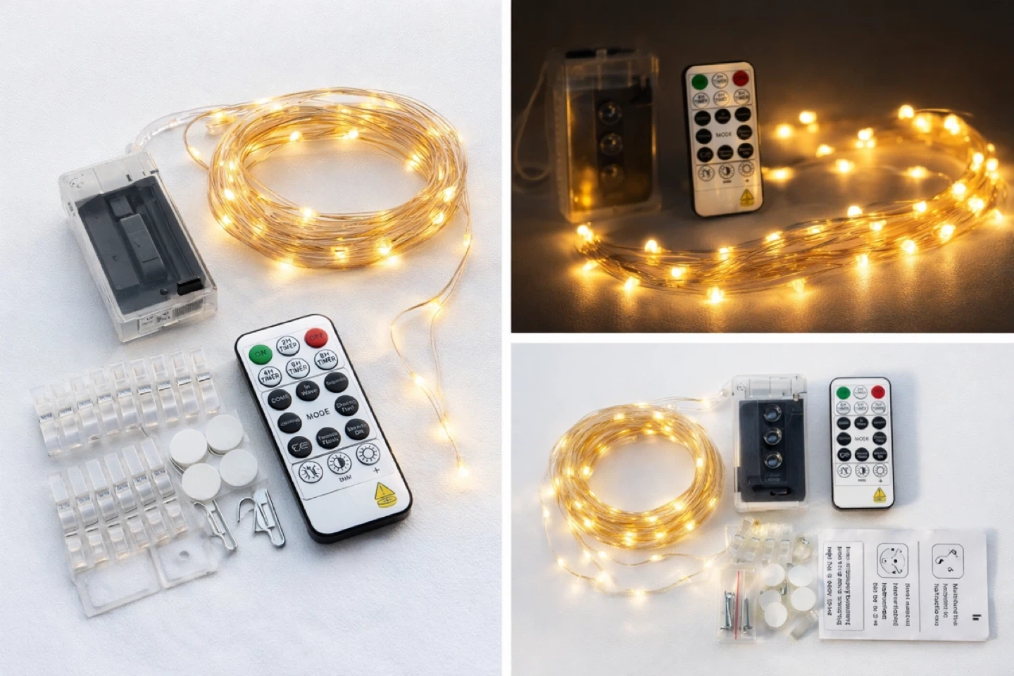 This Beautiful warm HXWEIYE 120 LED fairy lights comes with remote and full installation kit.