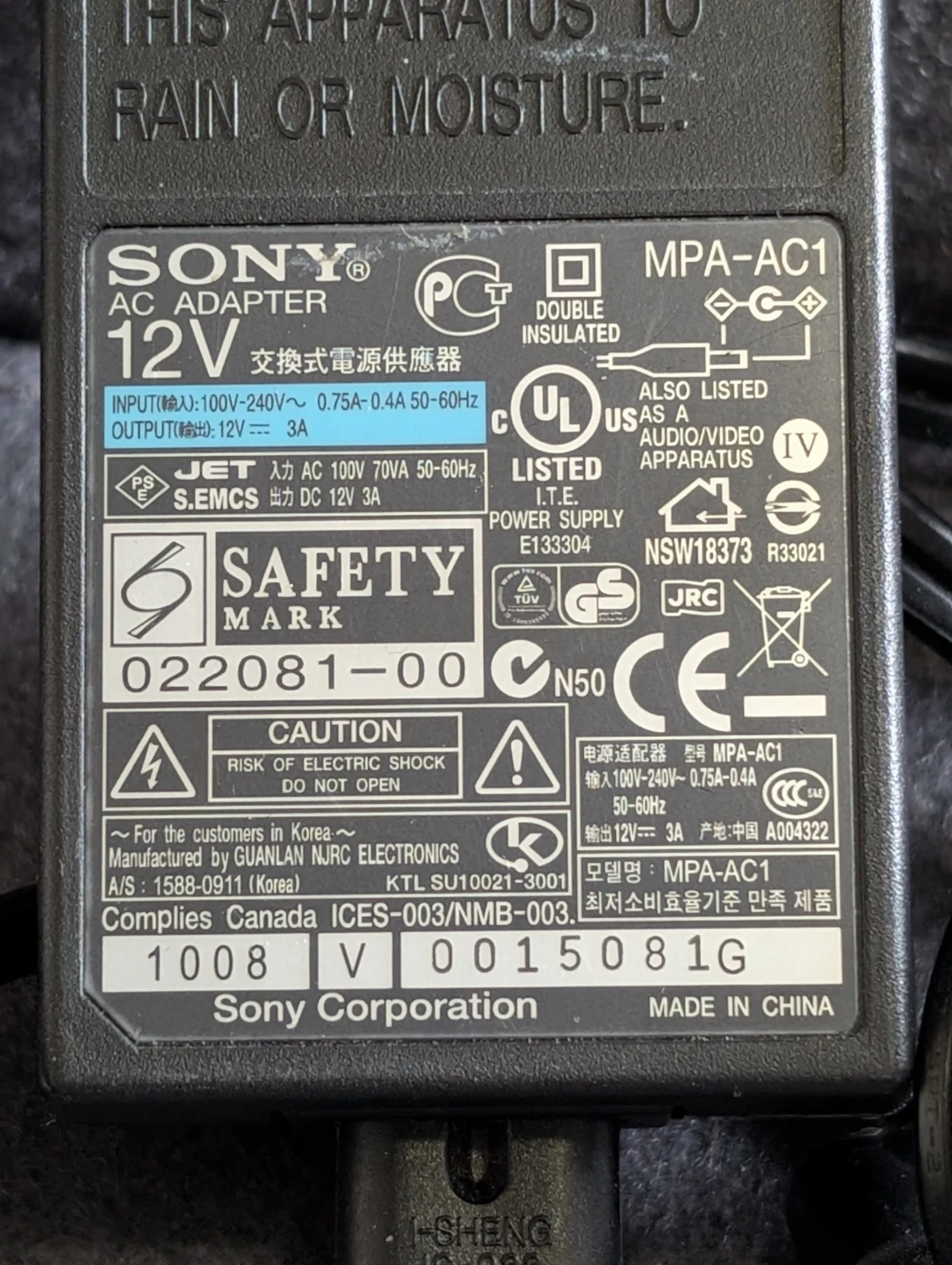 Sony MPA-AC1 AC Adapter 12V/3A
