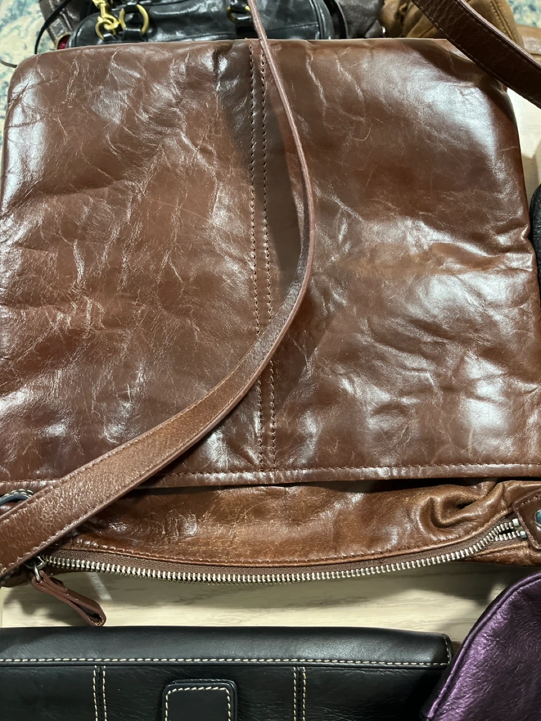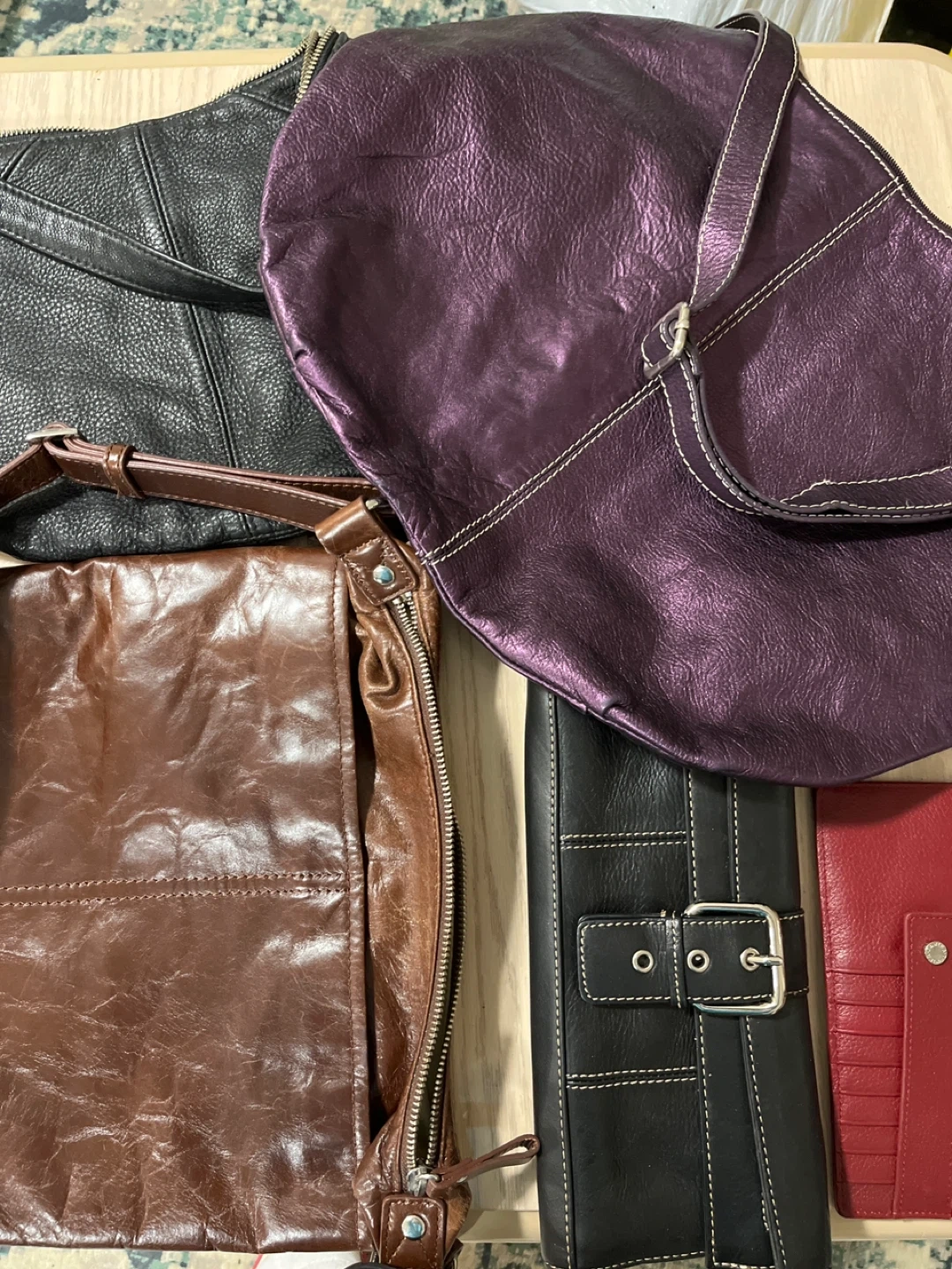 Lot of 5 various colours and black leather shoulder strap purses, clutch wallet with a buckle closure. It has a wrist strap. It's made of genuine leather.