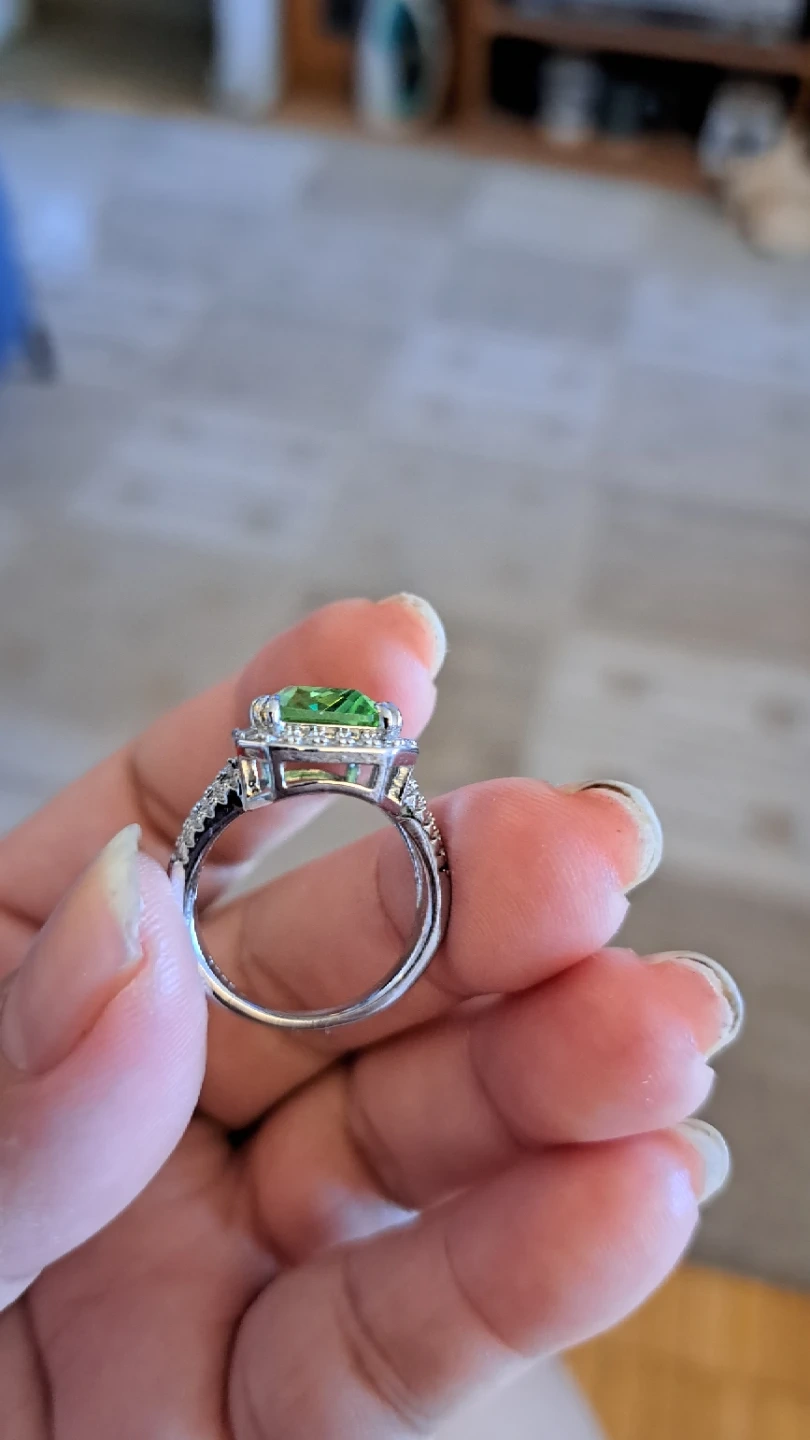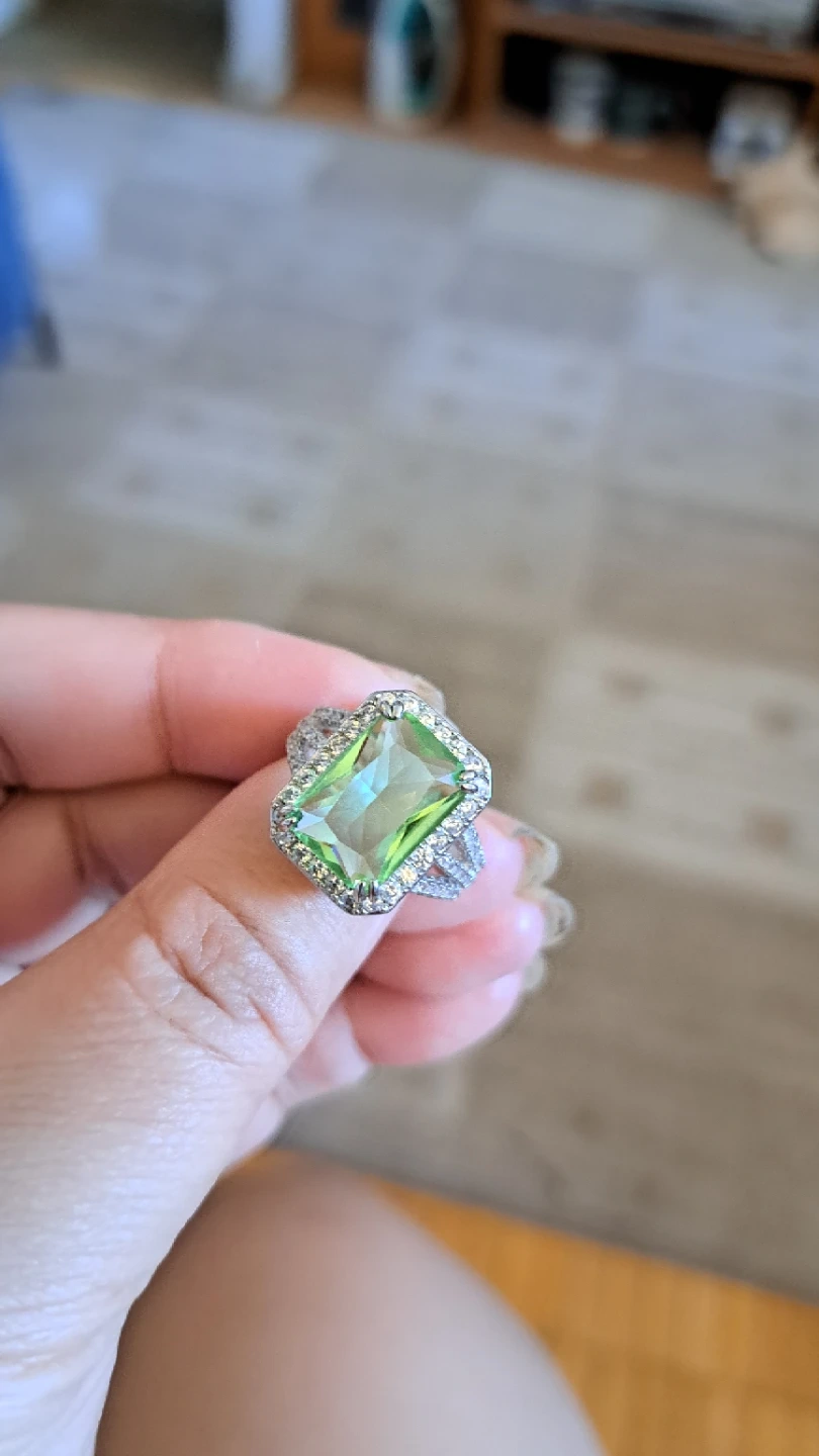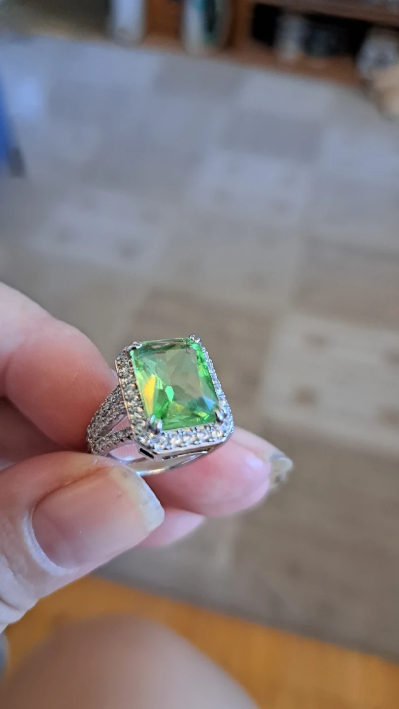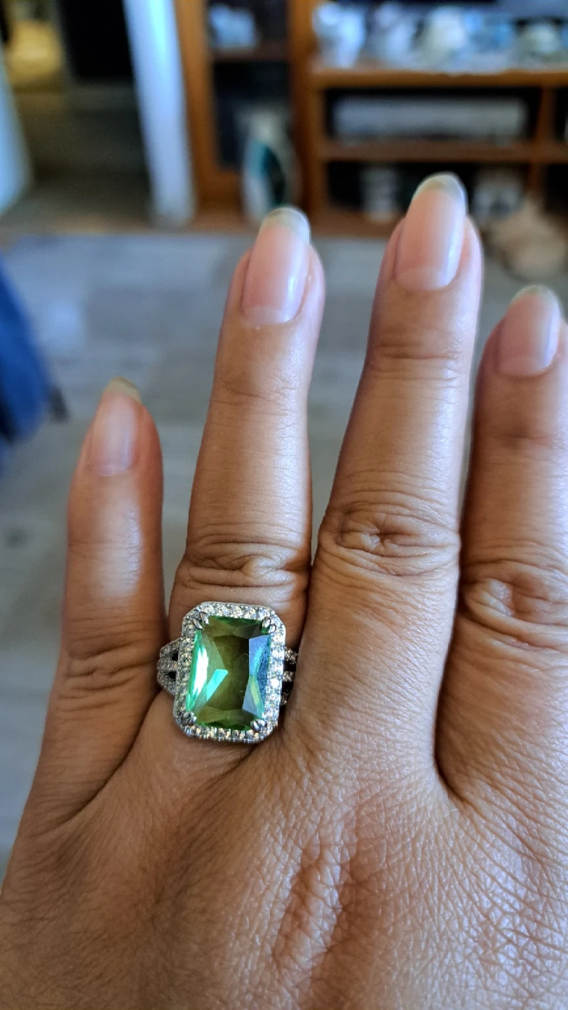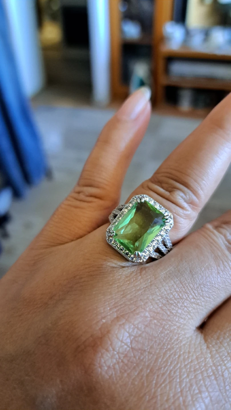 Beautiful ring featuring a large, emerald-cut green gemstone surrounded by small clear stones. The band is silver-toned with a textured design. It's a real eye-catcher!