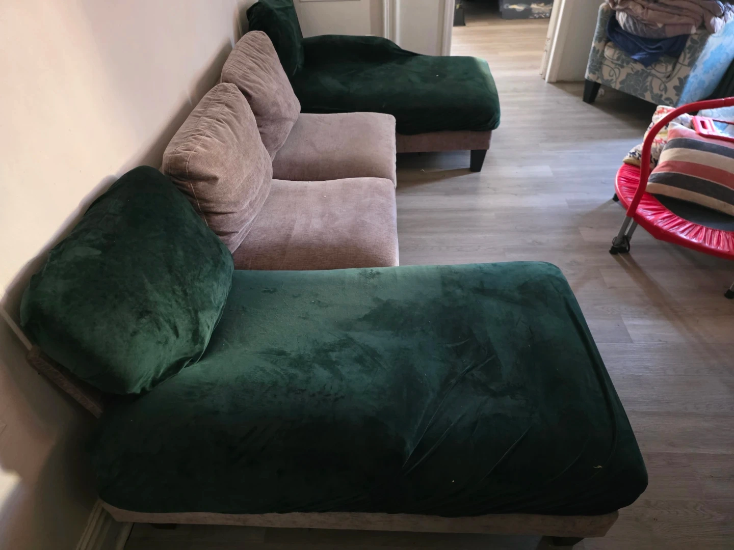 Small space U-shaped couch . The couch is not green that's just the couch cover which i have in beige as well