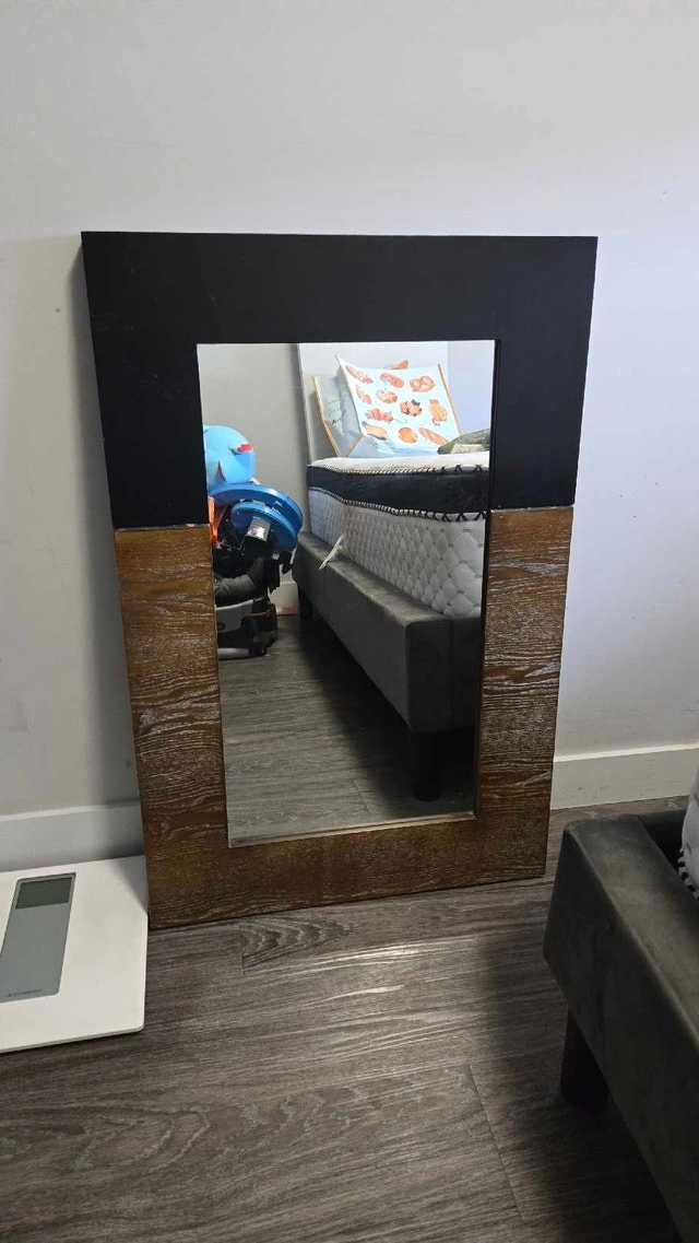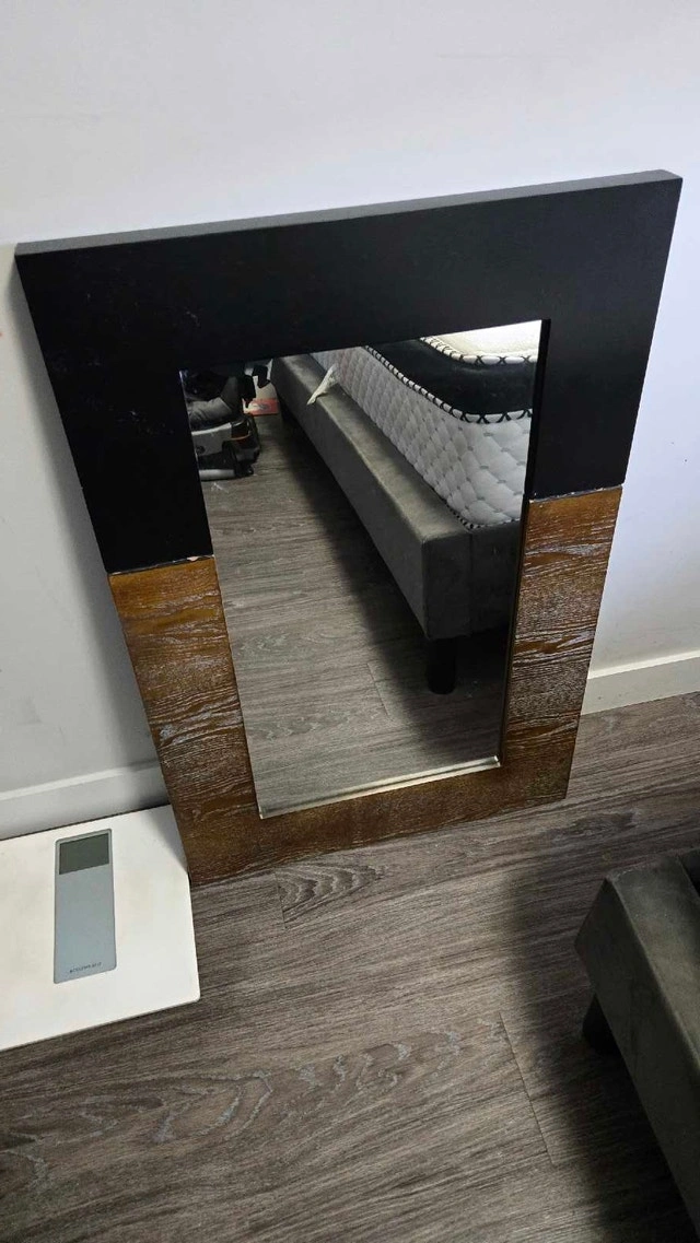 Add a touch of modern elegance to your space with this stylish mirror, featuring a unique black and gold-tone frame. This mirror is in used condition, ready to bring a distinctive flair to any room. It measures 24x36 inches, a great size for an entryway, bedroom, or living area. If the ad is still up, the mirror is still available! Cash accepted.