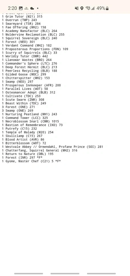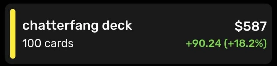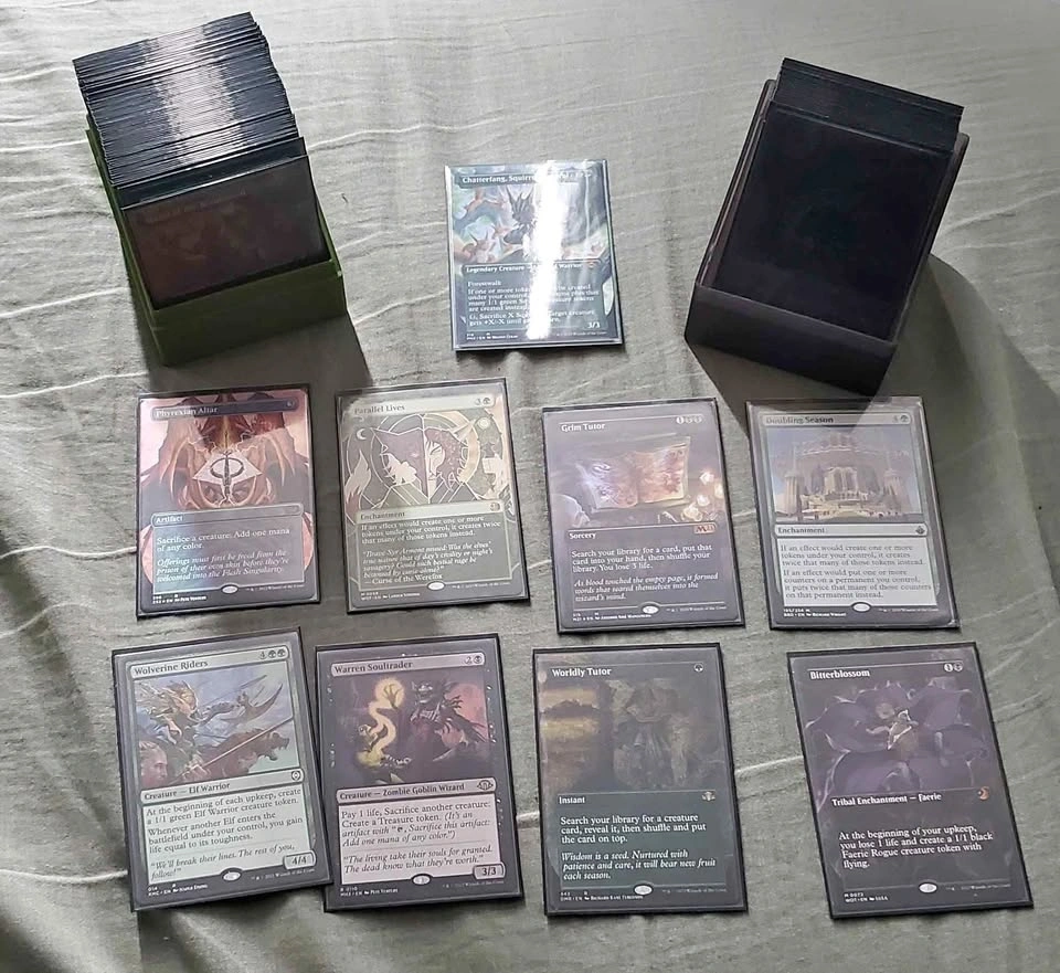 Selling my Chatterfang commander deck. This has been my pet deck for a while now but I am selling it as I don't play as often as I used to. It's a lot of fun to play with some combos in it. I have added the deck list in the photos. I am looking to get $550 or best offer. It comes pre double sleeved and with the deck box.