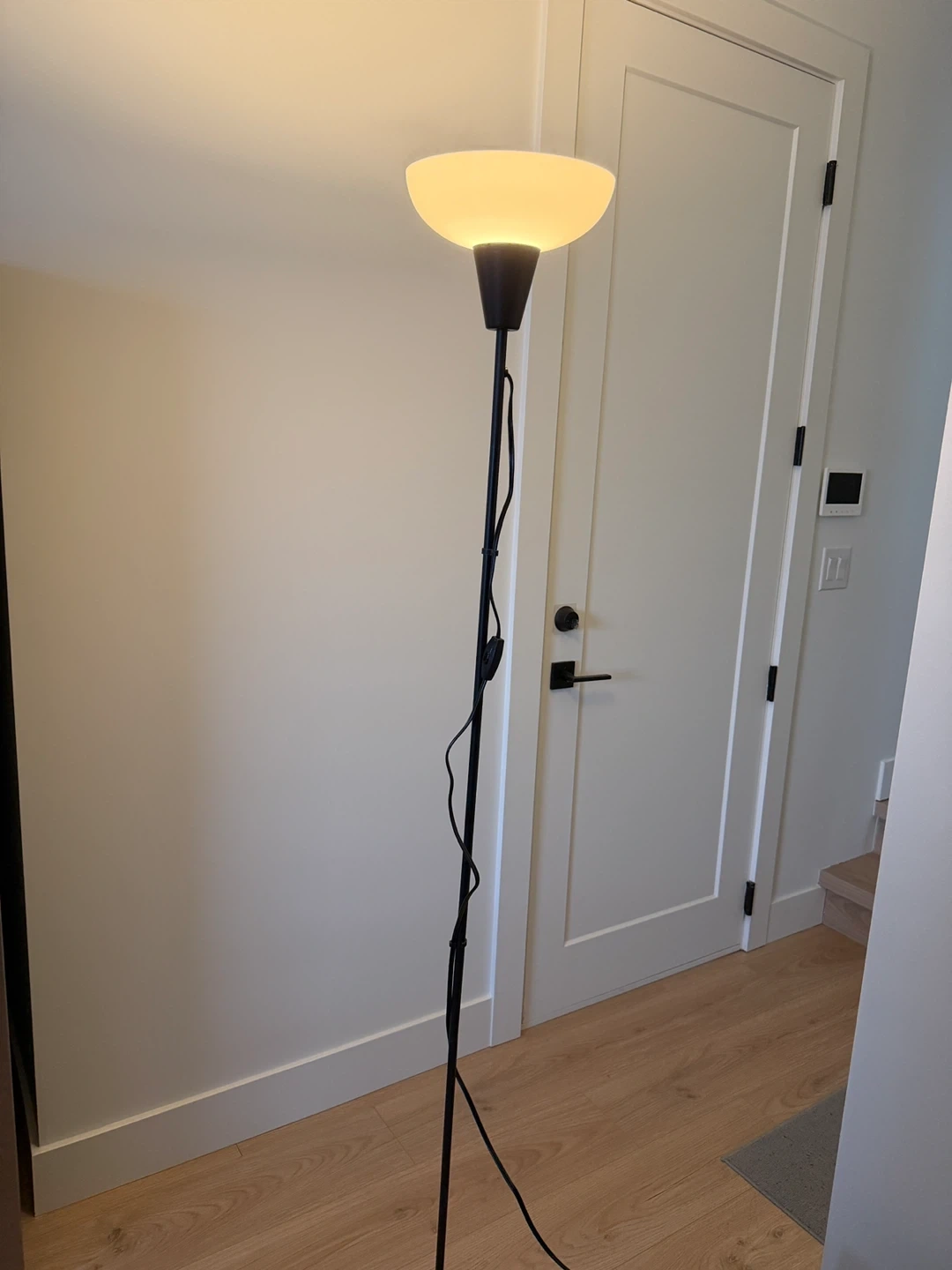 This black floor lamp from IKEA has a simple, modern design. It's perfect for providing ambient lighting in any room. The lamp stands tall and has a circular base.Used only for a few months.