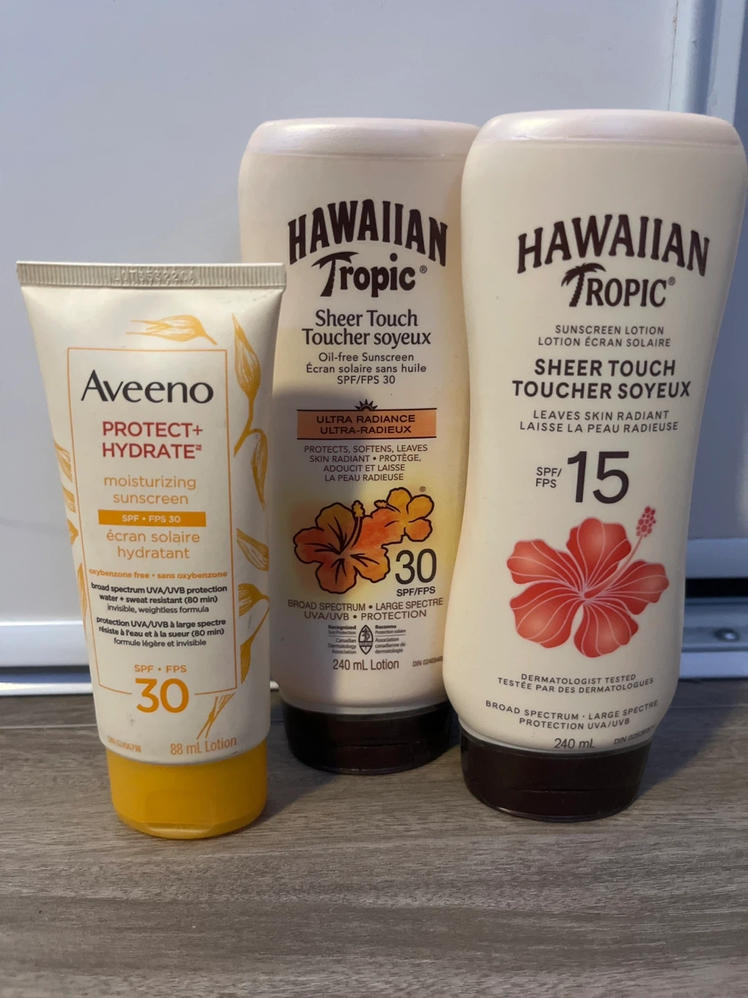 Three sunscreen lotions are available. One Aveeno Protect + Hydrate moisturizing sunscreen SPF 30 in an 88 ml bottle. Two Hawaiian Tropic Sheer Touch lotions, one SPF 15 and one SPF 30, both in 240 ml bottles. Leaves skin radiant and protected.