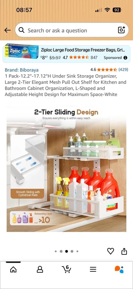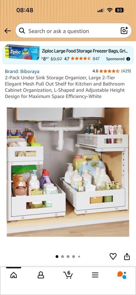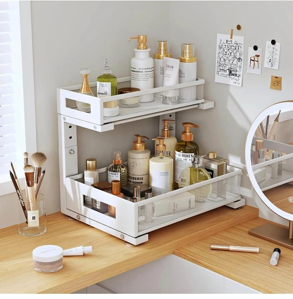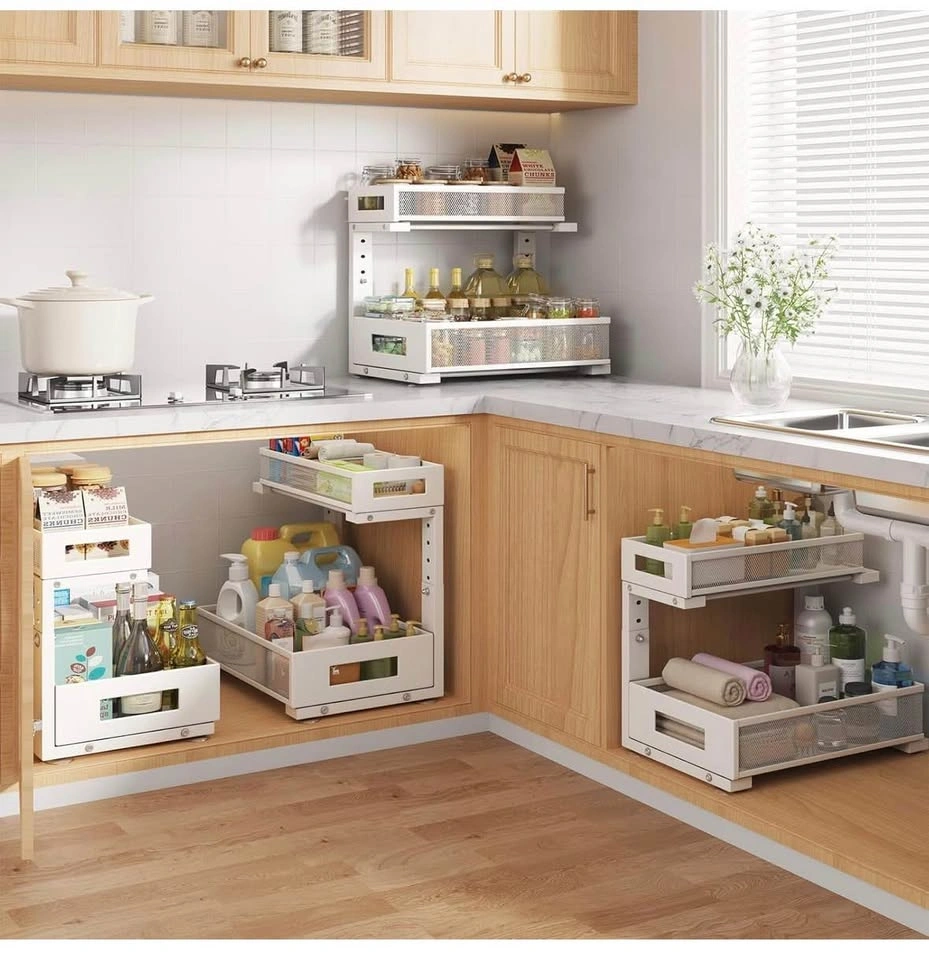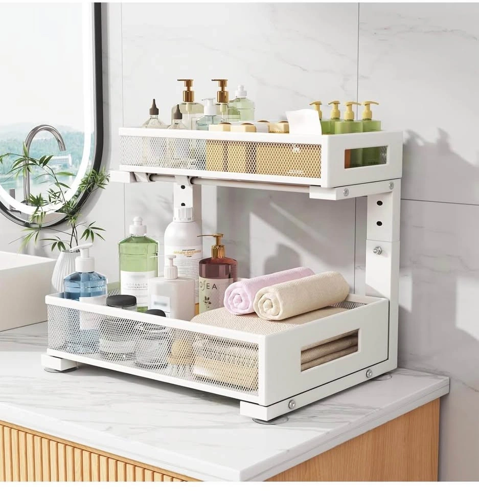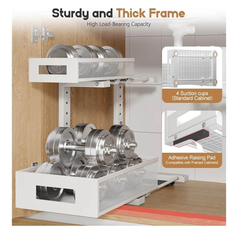 Brand new Biboraya Large 2-Tier Elegant Mesh Pull Out Shelf for Kitchen and Bathroom Cabinet Organization. Features a bottom basket size of 15.8" x 10" and a top basket size of 15.8" x 6.5". The double-layer pull-out design allows easy access to items. L-shaped design and 5-level adjustable height optimize under-sink storage. Material is carbon steel.