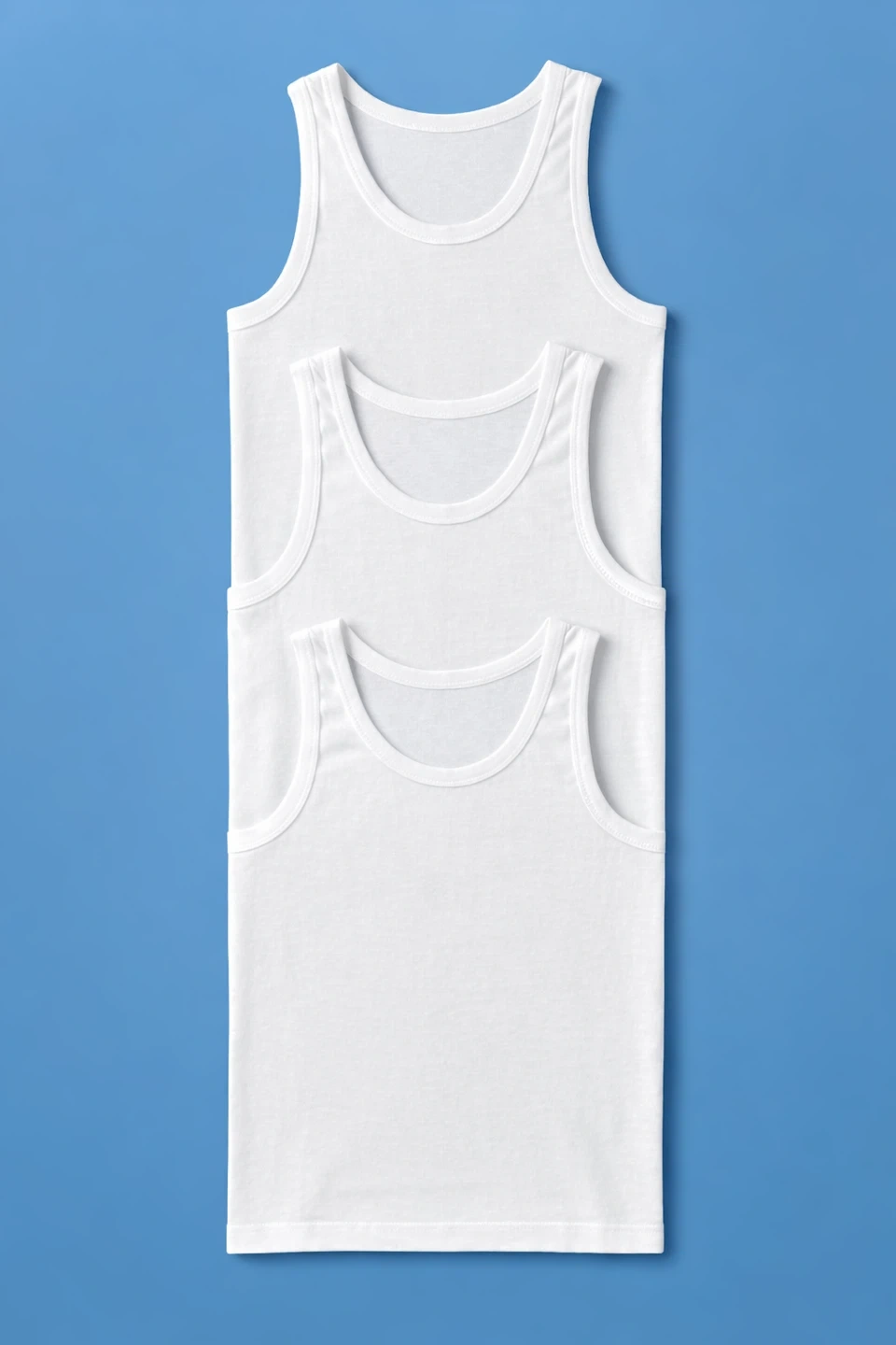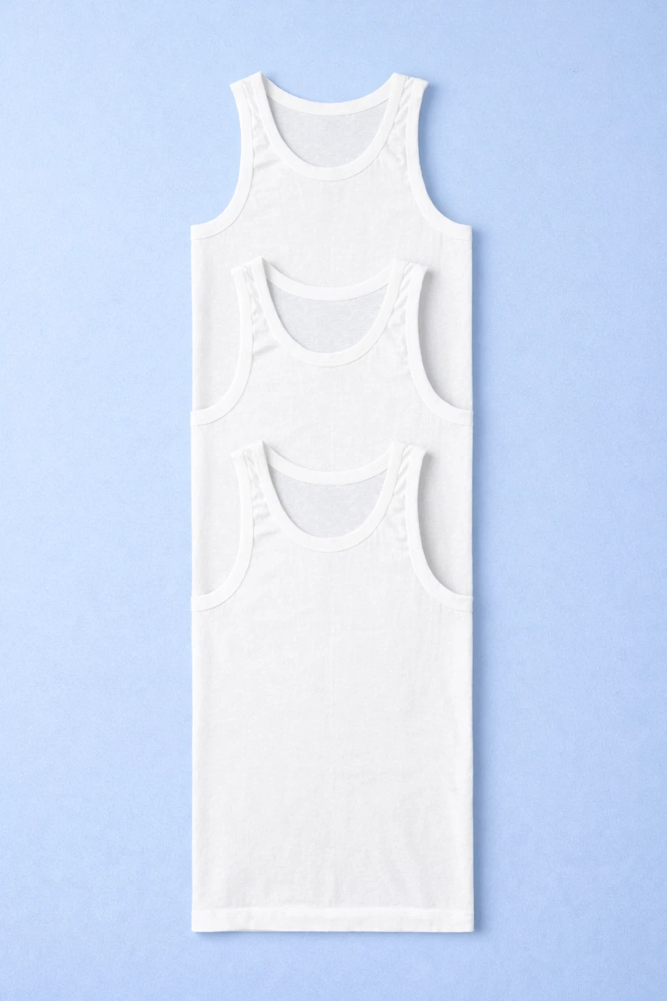 This pack includes three white, ribbed tank tops for boys. They're made from a soft cotton blend for comfort. Perfect for layering or wearing on their own!