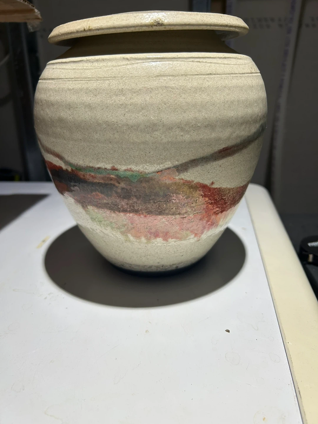Beautiful Raku pottery vase with a unique glaze. It's handcrafted and features earthy tones with splashes of red and green. This piece would make a lovely decorative accent for any home.