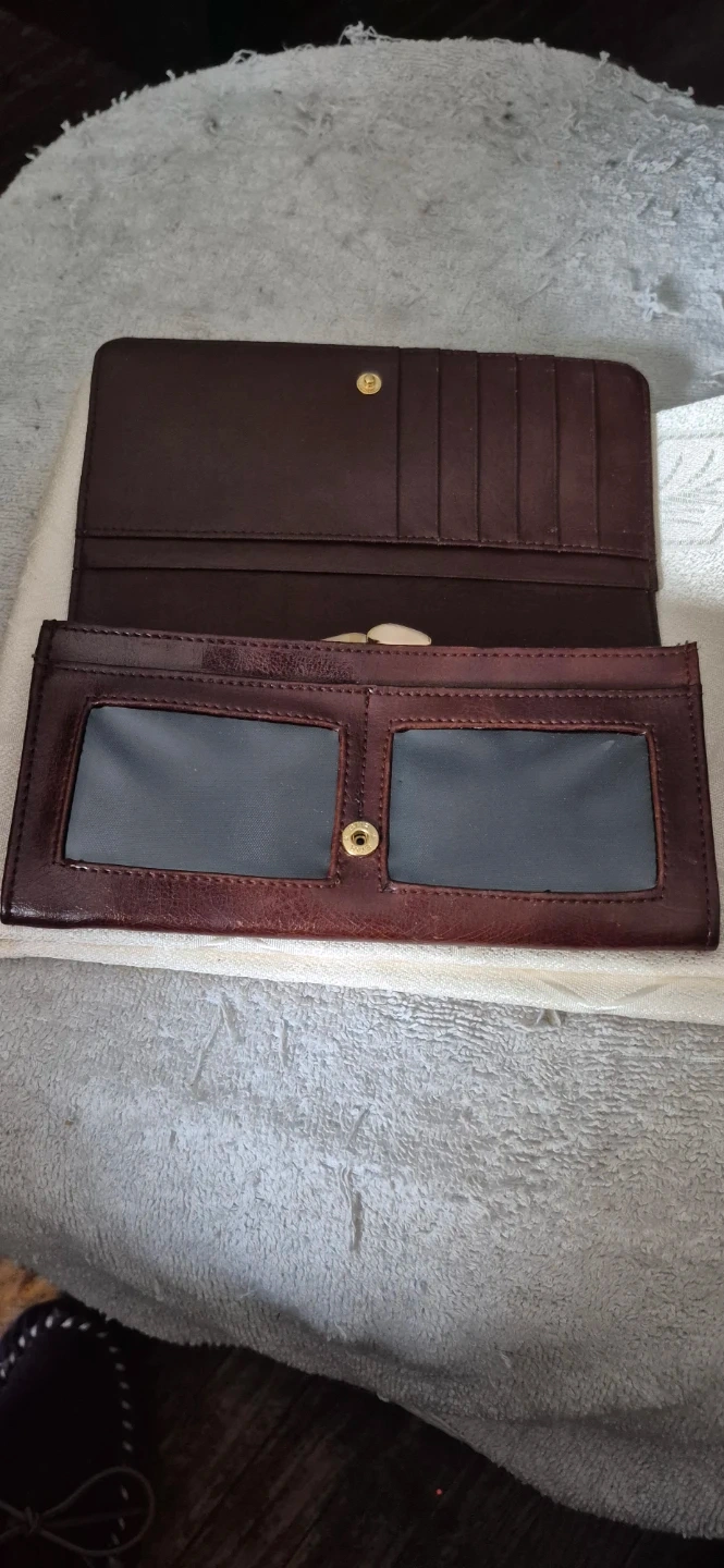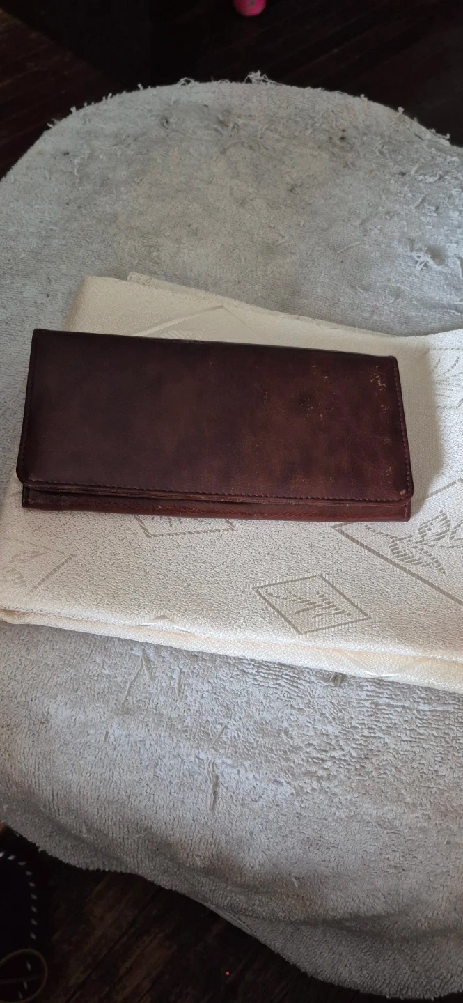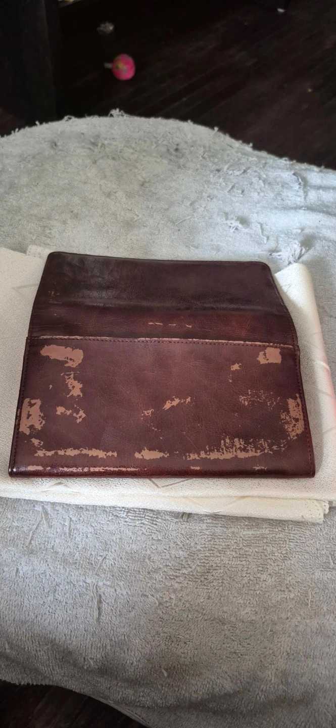 Selling a brown leather wallet. It has some signs of wear but still has lots of life left! It features several card slots and compartments.
