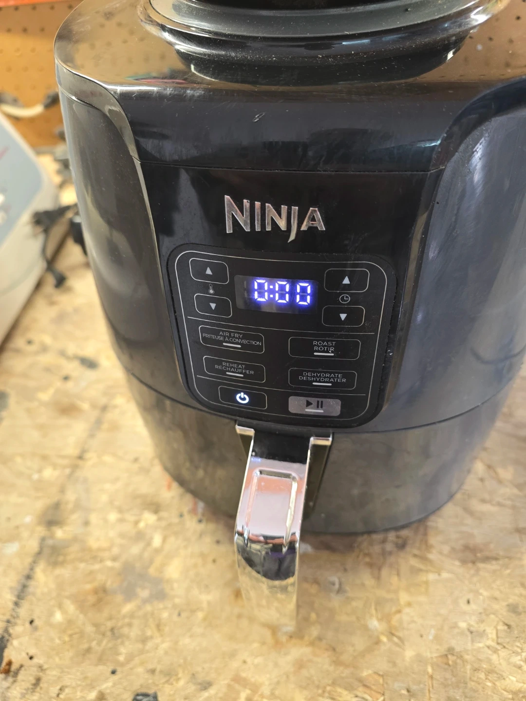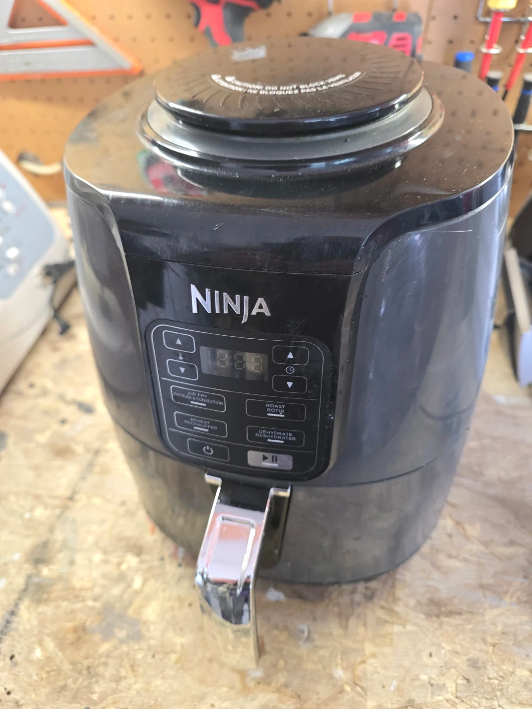 This black Ninja air fryer offers multiple cooking functions including air fry, convection, reheat, dehydrate, and roast. It's a handy appliance for quick meals. The basket has a non-stick coating.
