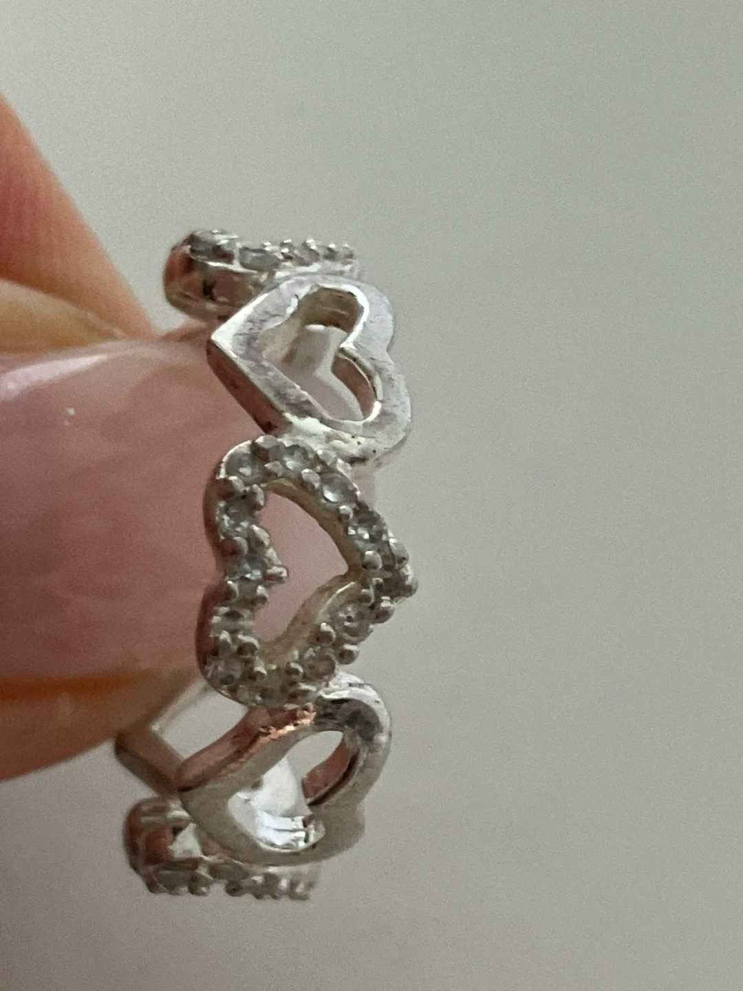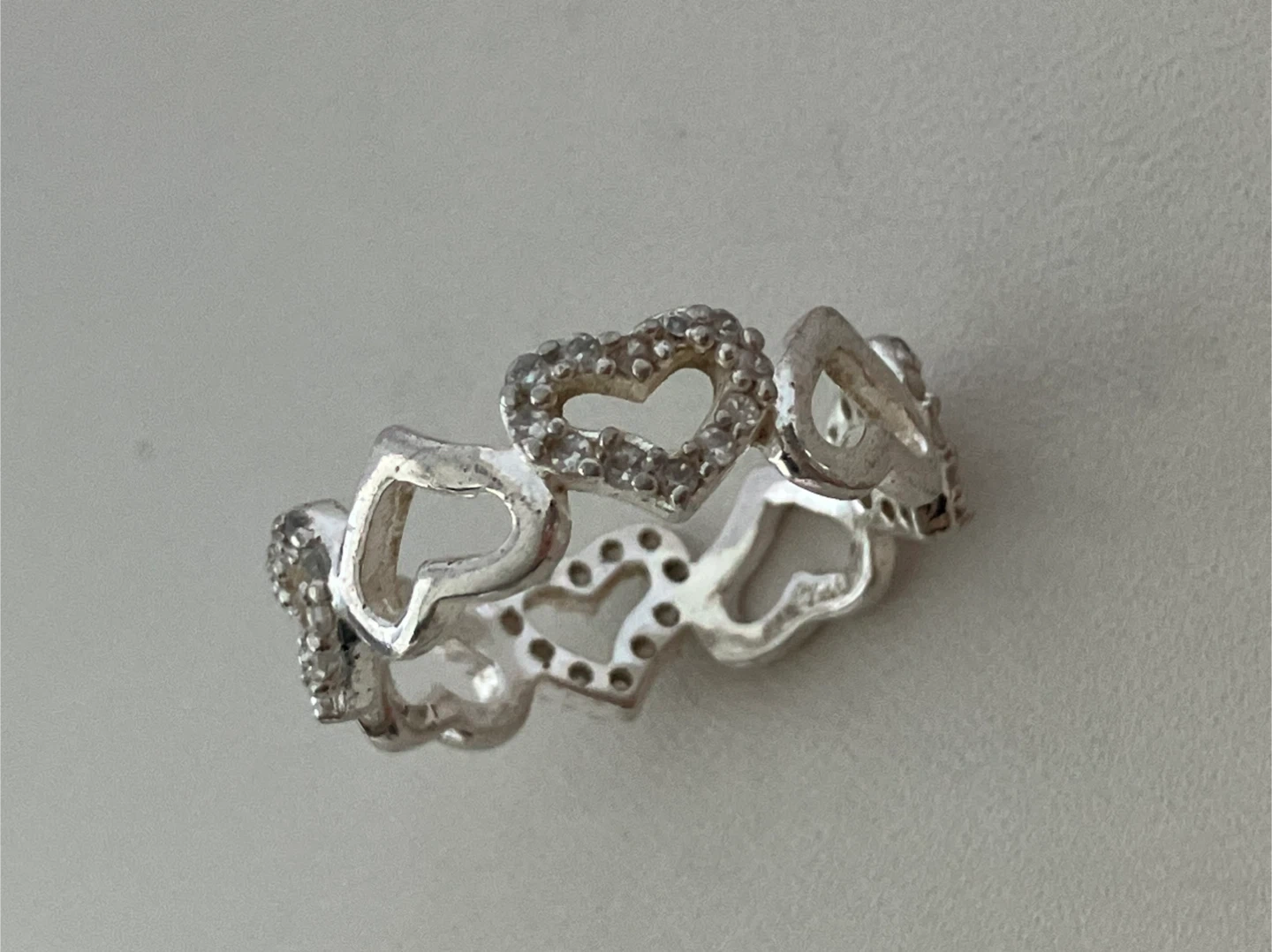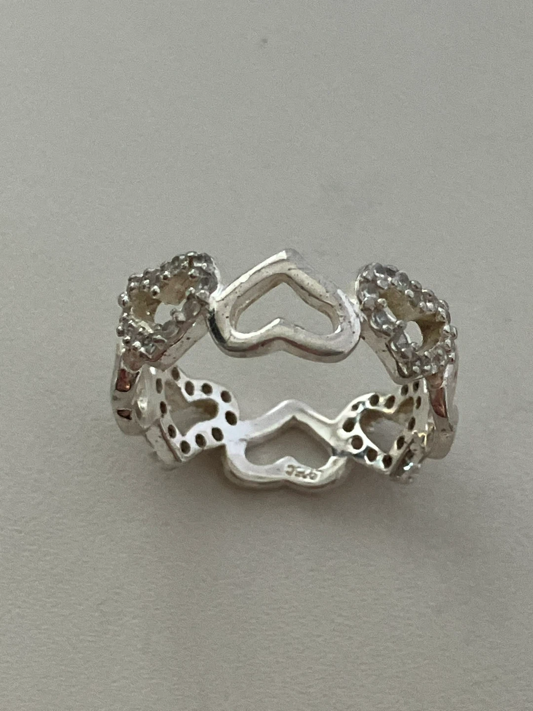 Sterling silver band ring size 7.75, featuring a repeating heart design. Some hearts are accented with small cubic zirconia stones for a touch of sparkle. Comes in a presentation box.