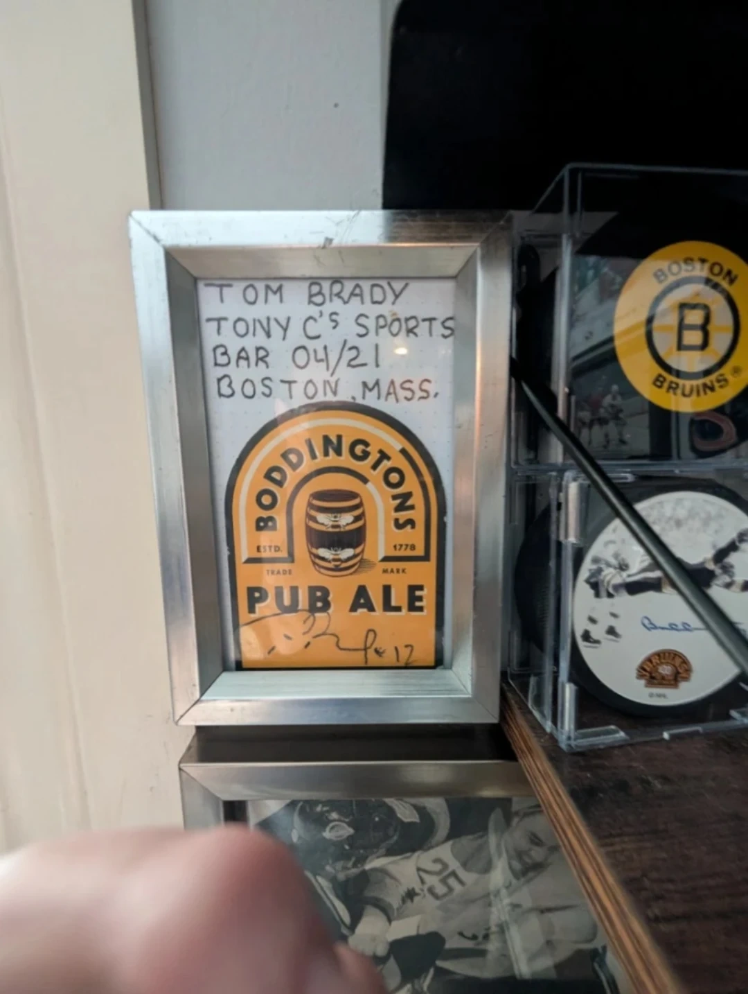This is a Boddingtons Pub Ale sign, featuring Tom Brady and Tony C's Sports Bar from Boston, Mass. The date shown is 04/21. It's a unique piece for any sports or beer memorabilia collector!