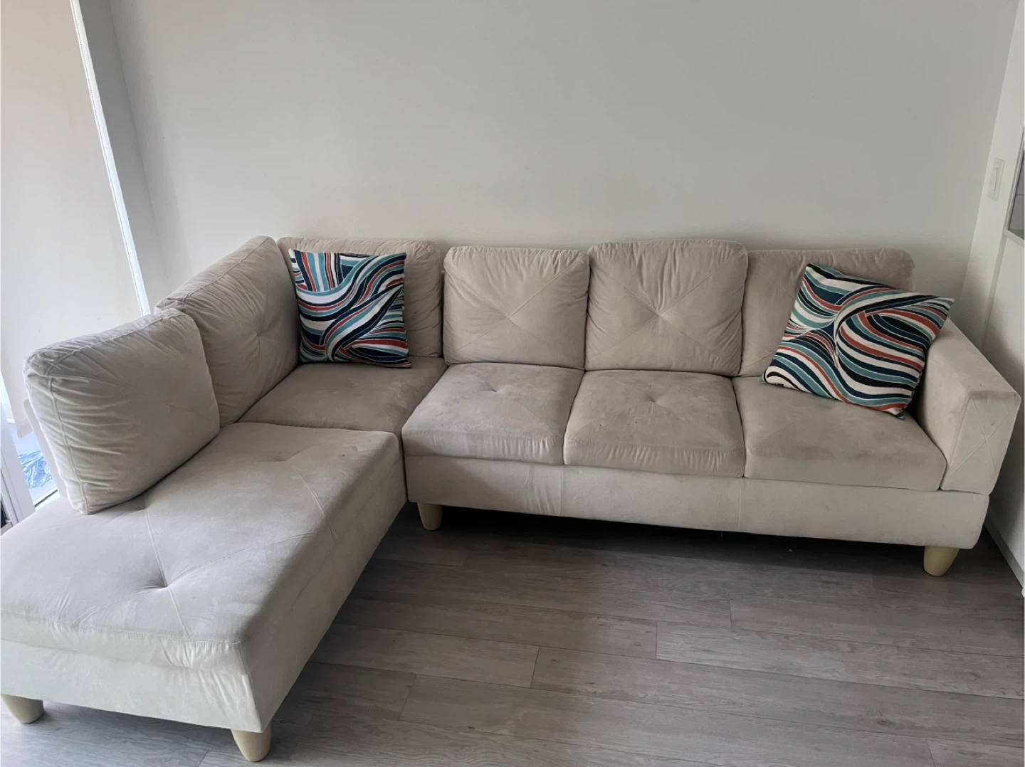 Comfortable beige sectional sofa with a chaise lounge. It's upholstered in a soft fabric and includes two decorative throw pillows. The cushions are tufted for a stylish look. This sofa's a great addition for lounging and entertaining!