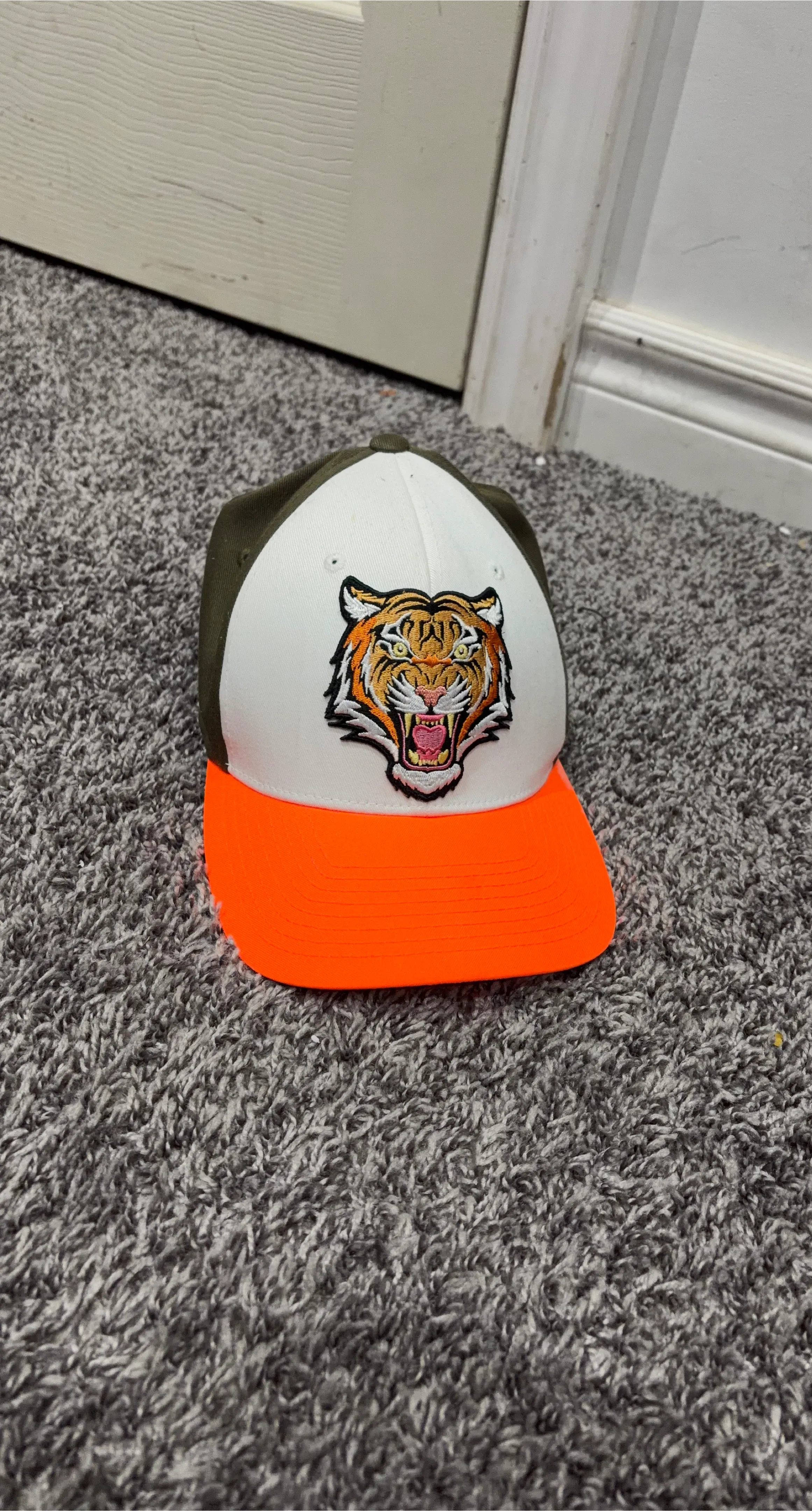 Cool baseball cap with a tiger graphic on the front! The cap features a white front, olive green top, and a vibrant orange brim. Perfect for adding a bit of flair to your outfit