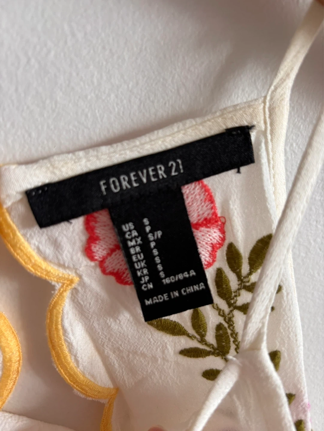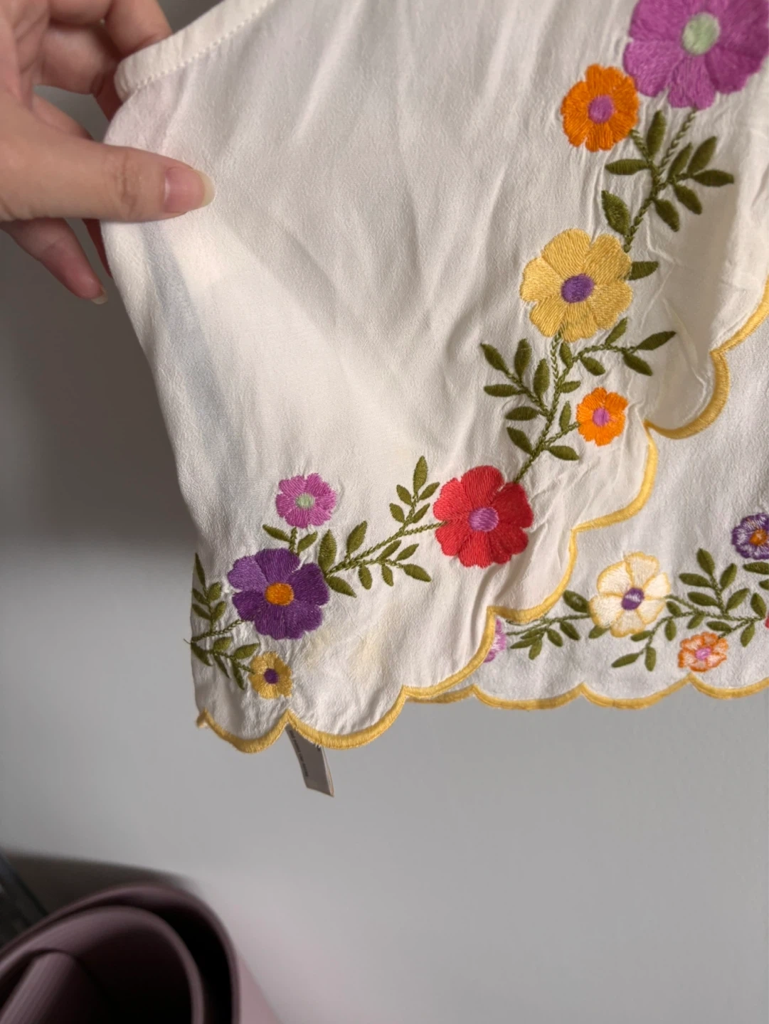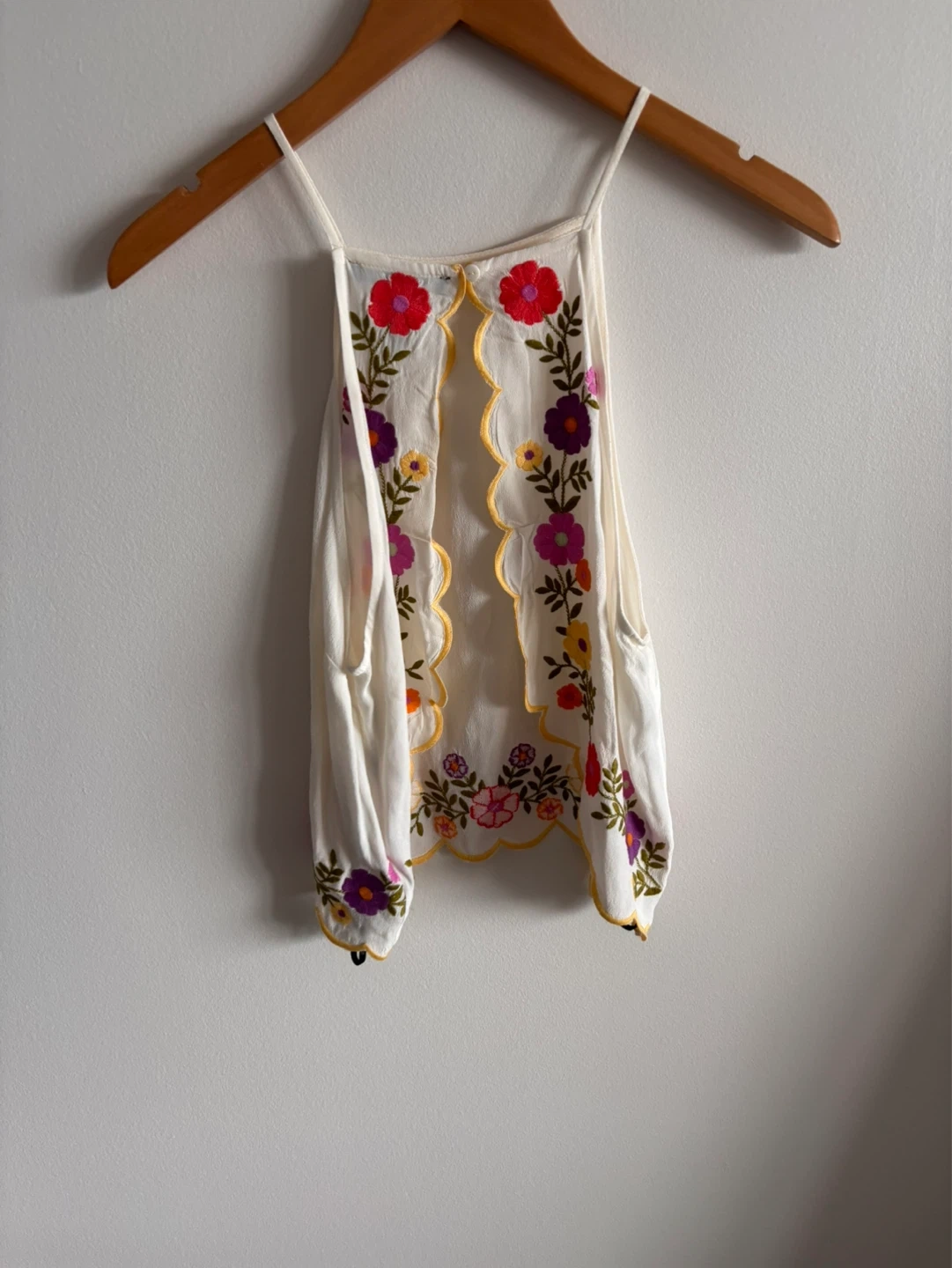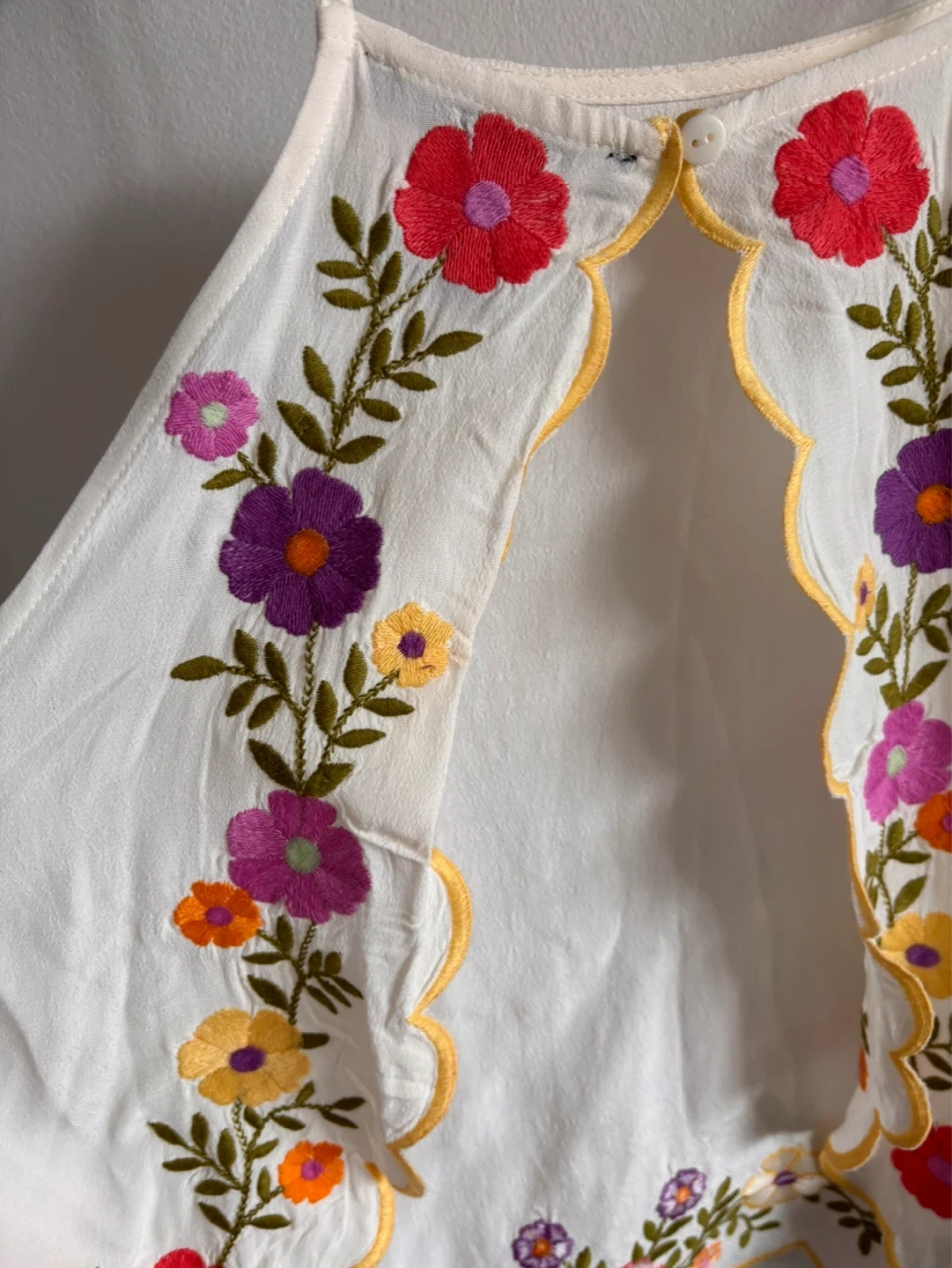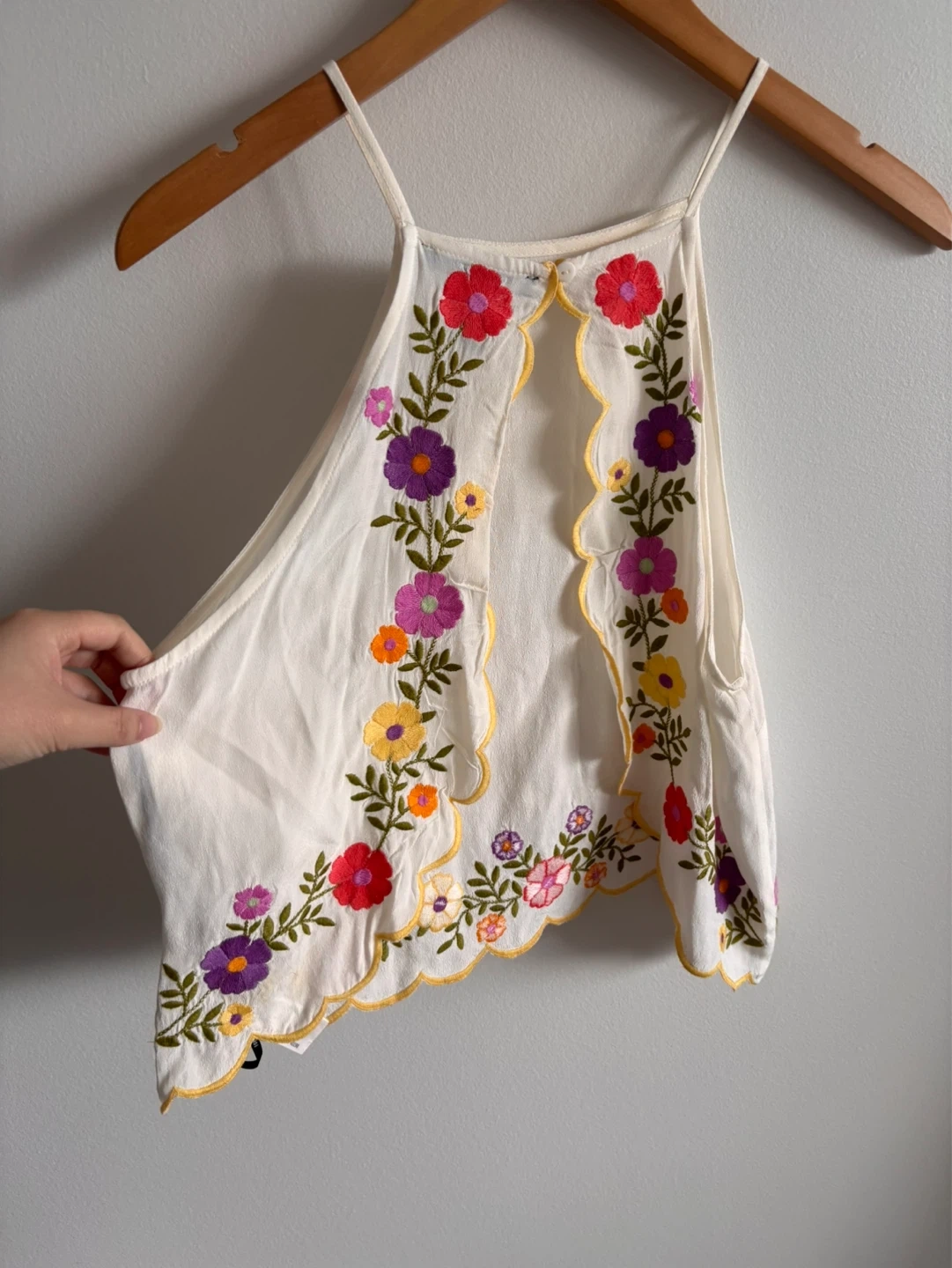 White halter top with colourful floral embroidery along the hem. It has thin spaghetti straps and a scalloped hemline. Lightweight fabric.