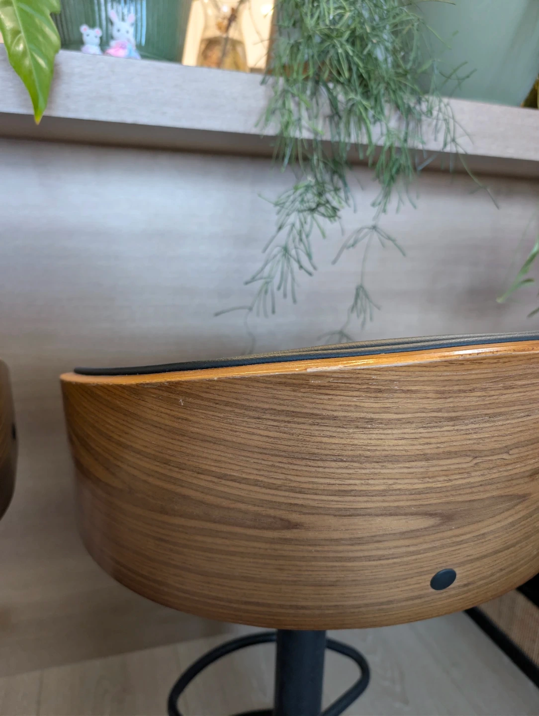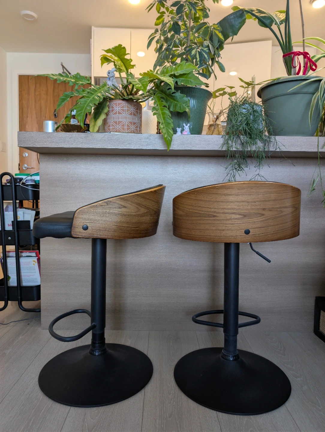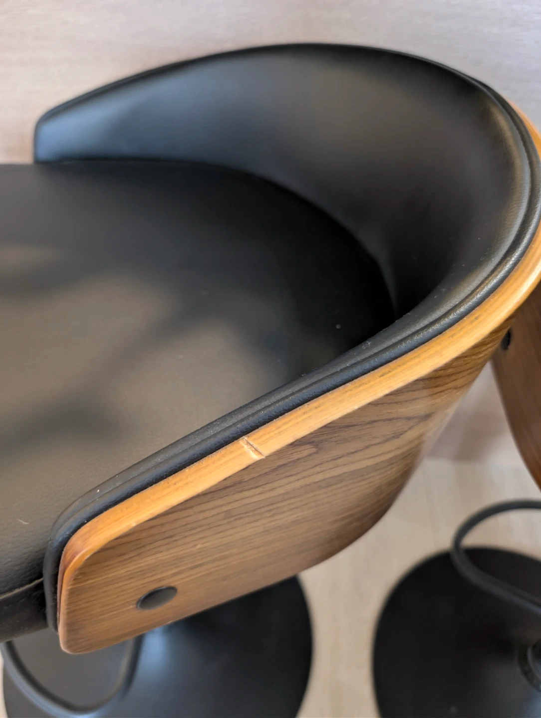 Two stylish bar stools with a black faux leather seat and a curved wood-finish back. They're adjustable in height.