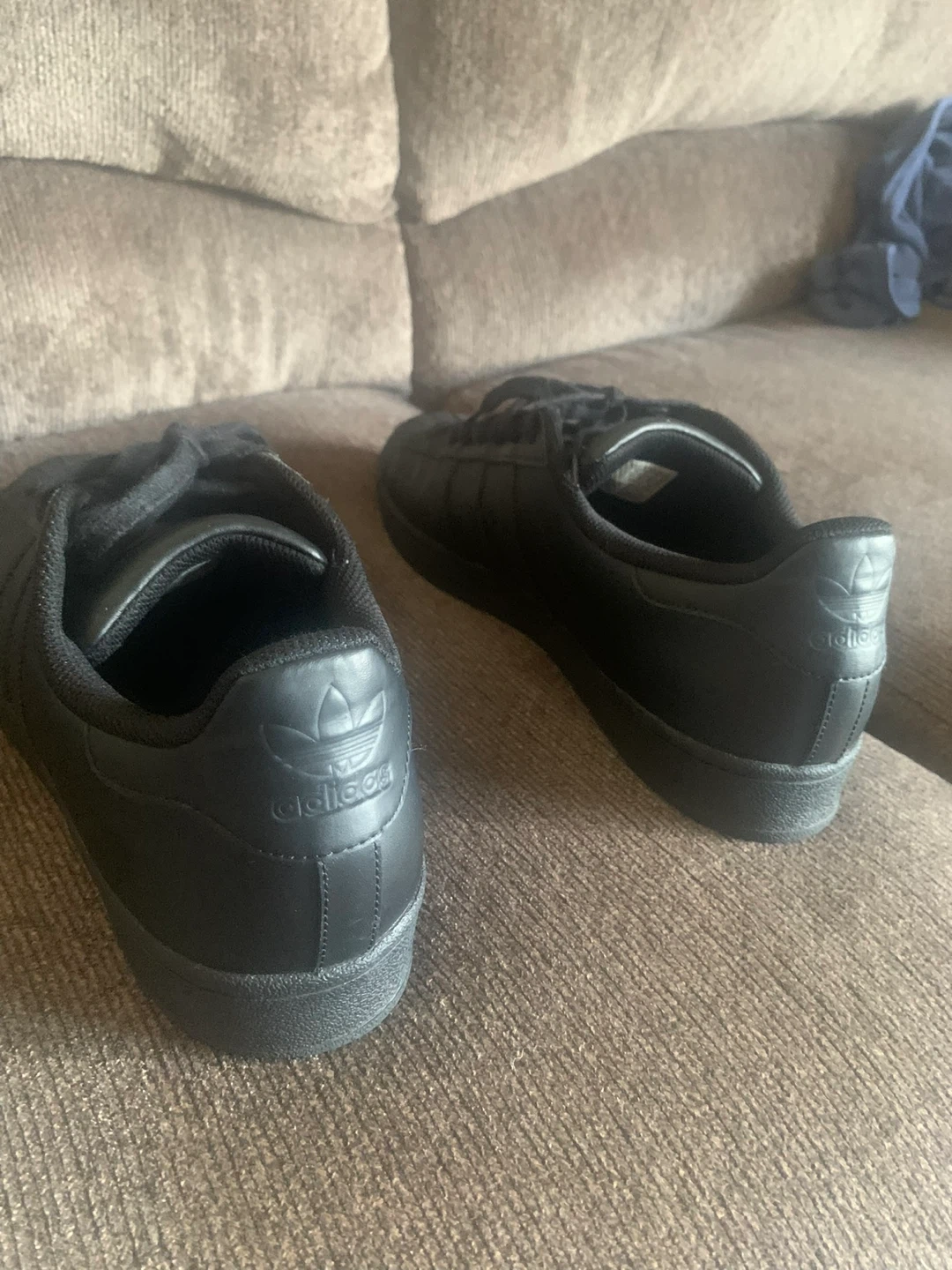 Selling a pair of Adidas Superstar sneakers in all black. They have the classic three stripes on the side and the iconic shell toe. They're in good condition and ready for a new owner!