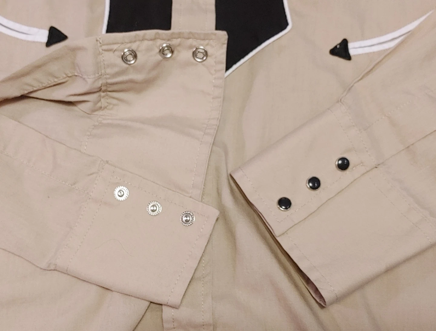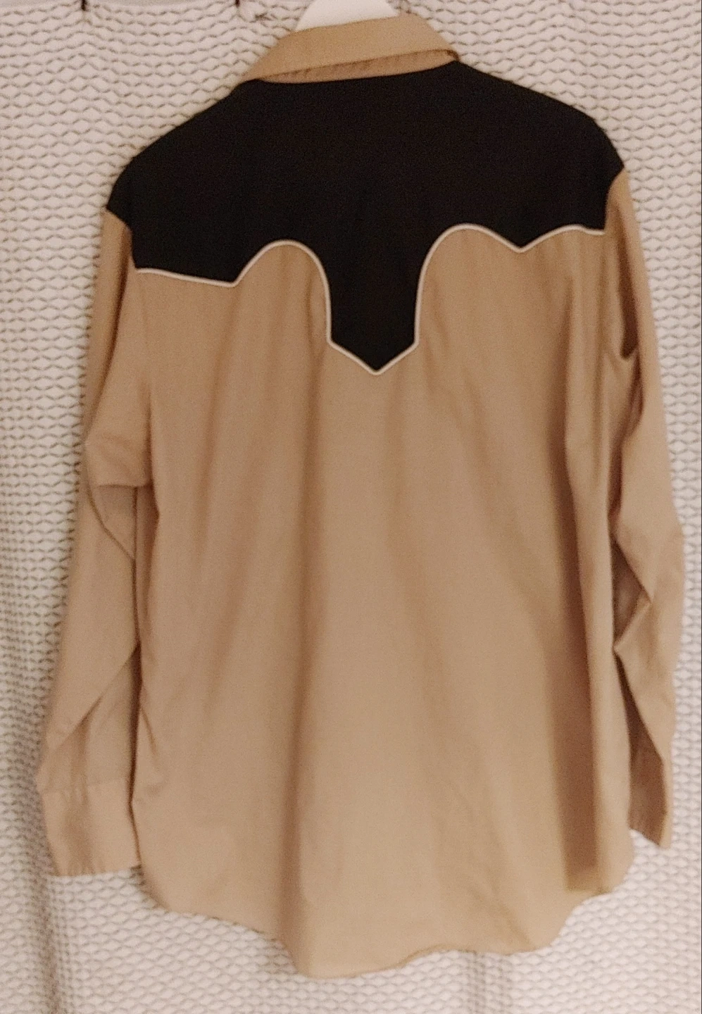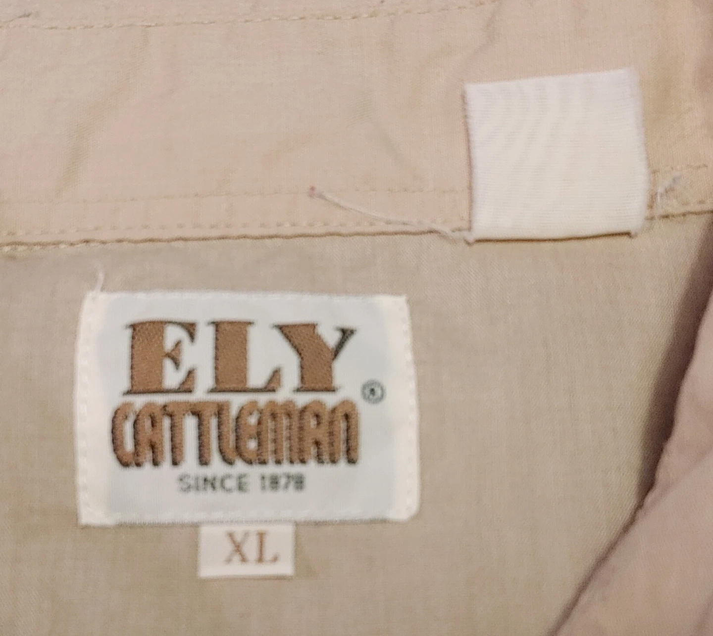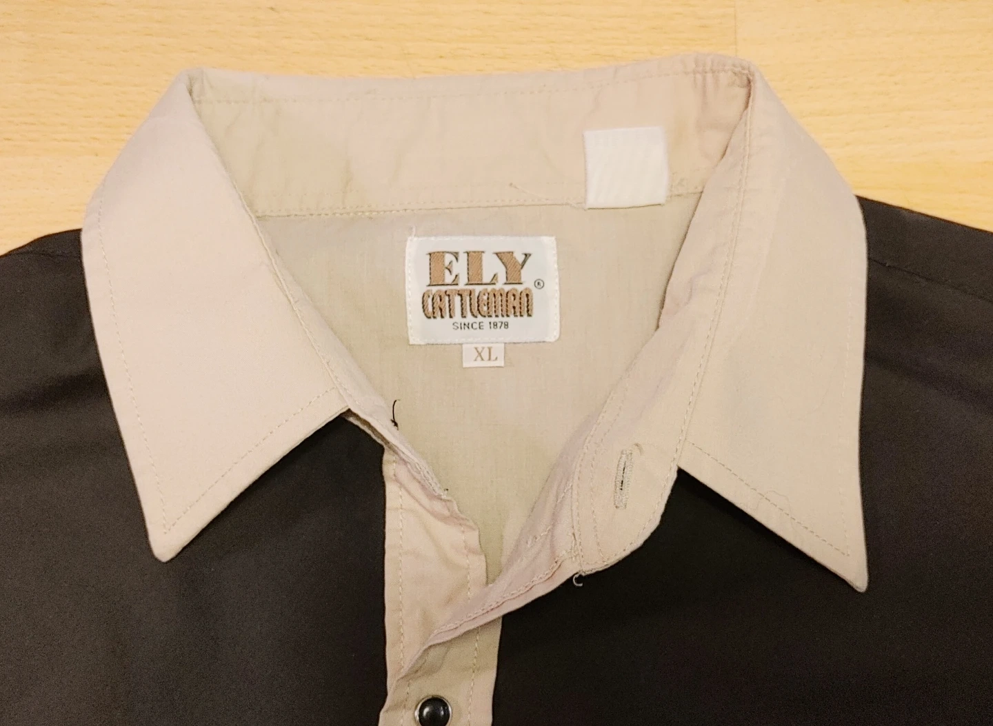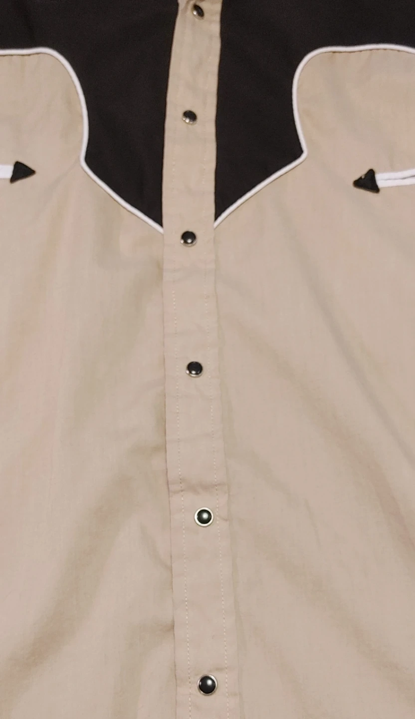 Mens vintage 70's/early 80's size XL tan and black long-sleeve western shirt from ELY Cattleman. Classic western yokes and snap button closures. Shirt is in good condition. Small marks on one sleeve but otherwise in very good shape. All snaps present and working perfectly. 2 front pockets. Smoke free home pick up Mt Brydges cash only.