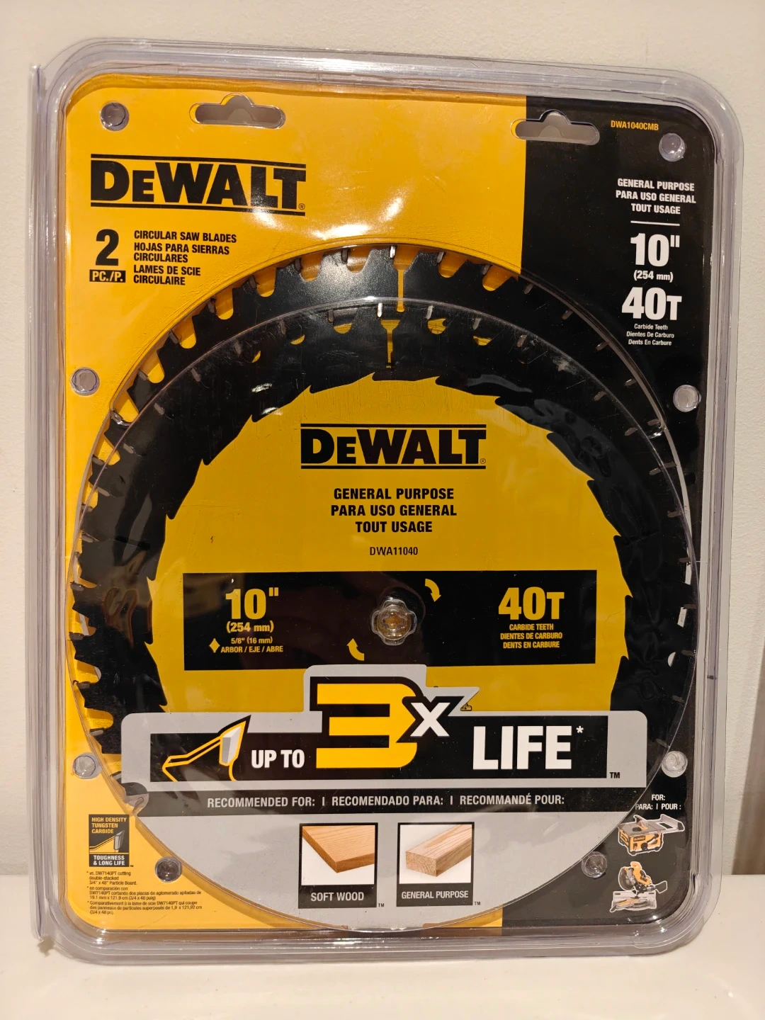 This is a 2-pack of DEWALT 10-inch circular saw blades. They have 40 carbide teeth for general purpose use. The arbor size is 5/8 inch.