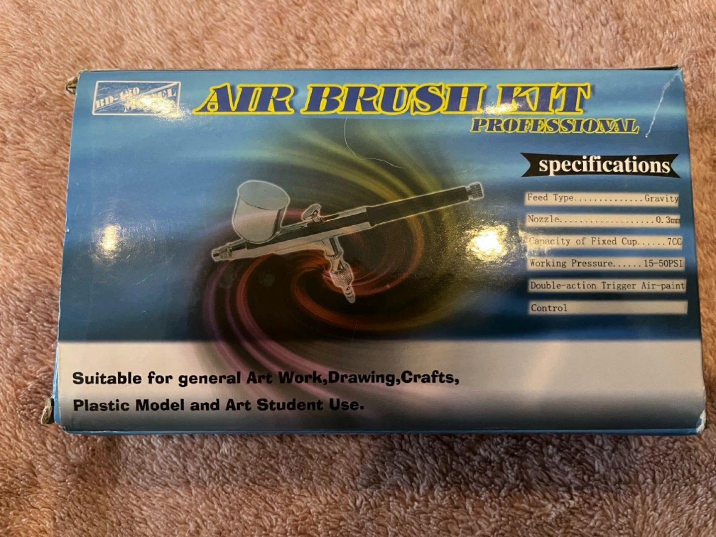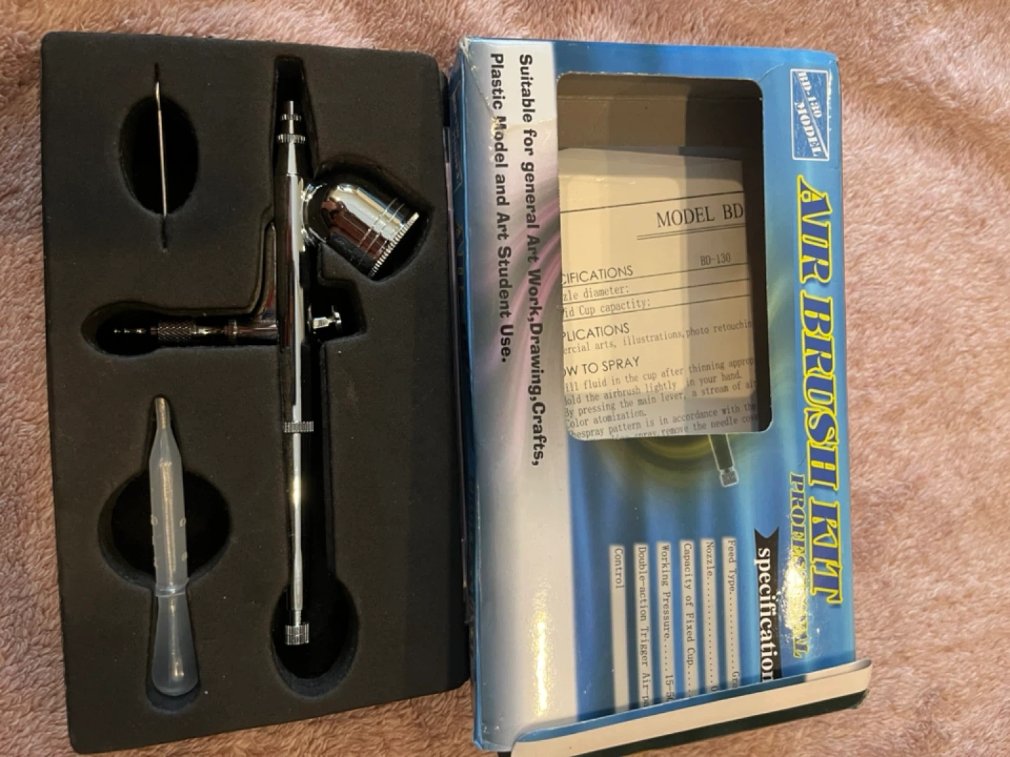 This is a professional air brush kit, model BD-130. It's suitable for general art work, drawing, crafts, plastic models, and art students. The nozzle diameter is 0.3mm, with a fixed cup capacity of 7cc. It operates at a working pressure of 15-50PSI.