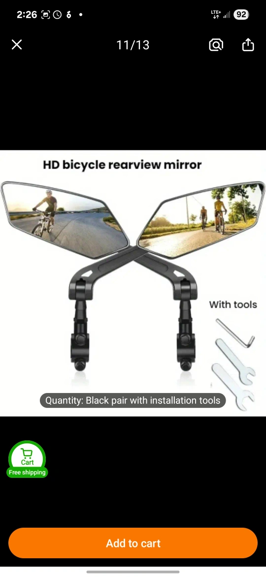 These HD bicycle rearview mirrors offer a 360° free adjustment to open up the field of view, plus they come with tools for installation! They're black and come as a pair