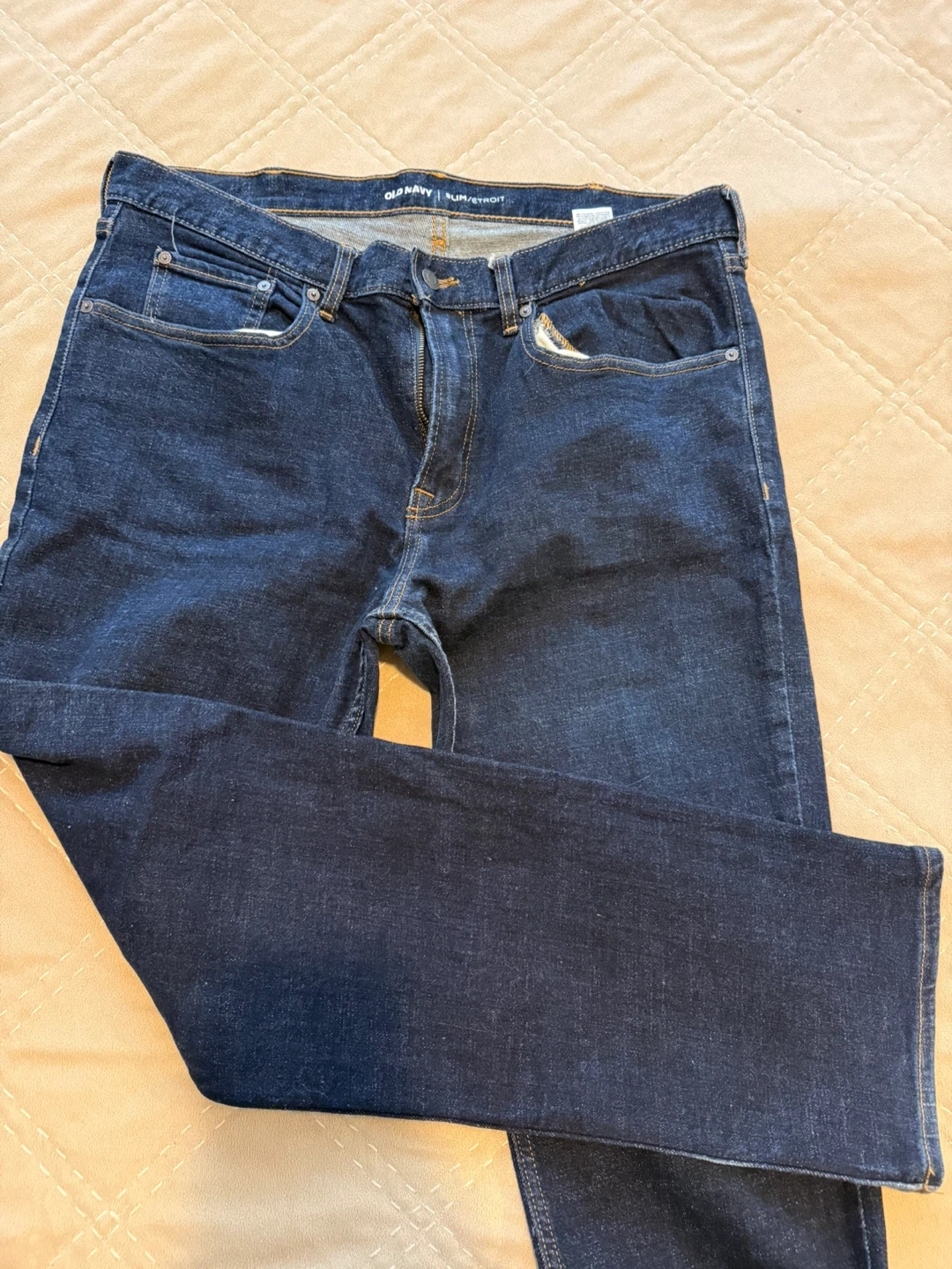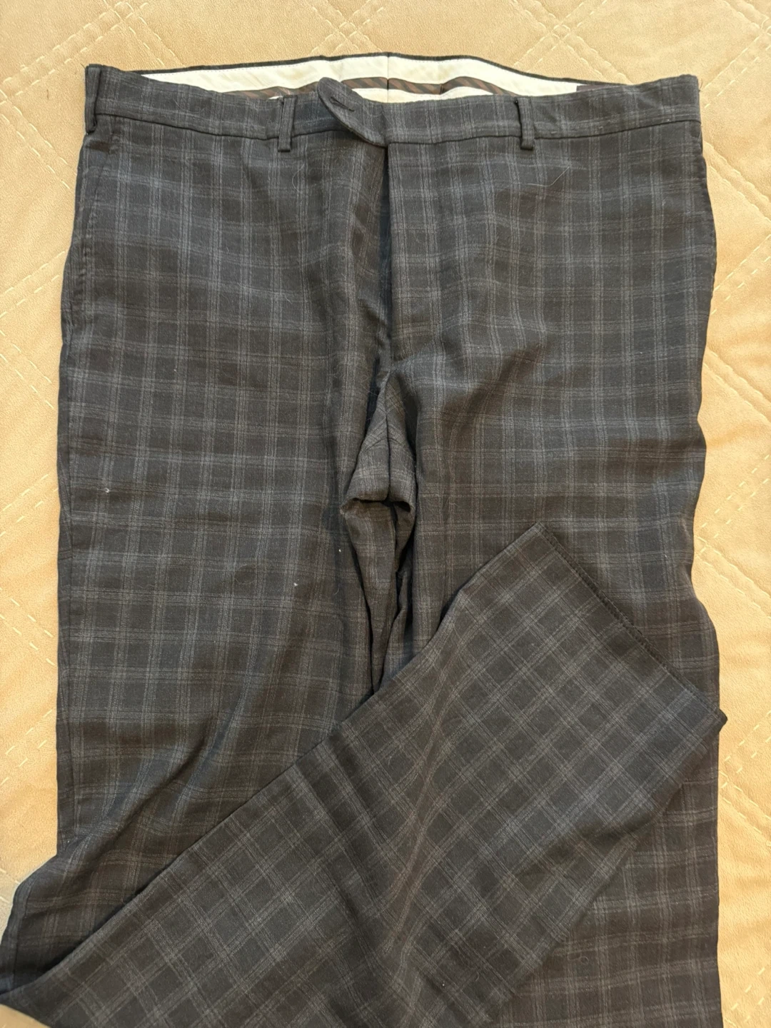 Bundle of five pairs of pants including Paige grey dress pants, Paige plaid pants, Old Navy dark wash jeans, and two pairs of slim fit coloured pants. Assorted sizes and materials.