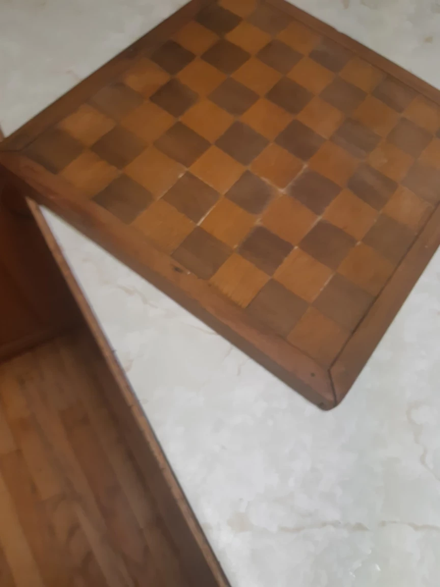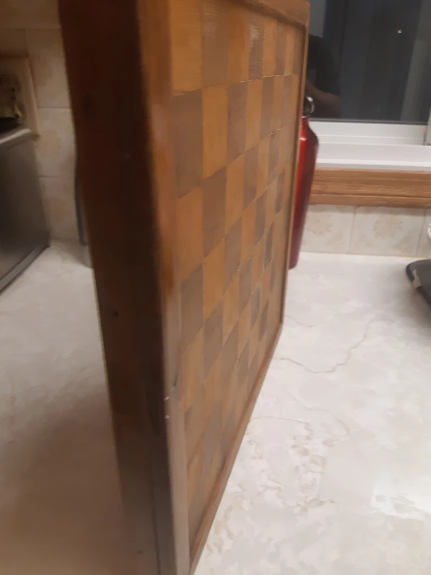 Selling a wooden chess board. It's in good condition and ready for a new home! The board has a classic checkered pattern and the wood has a warm, natural tone