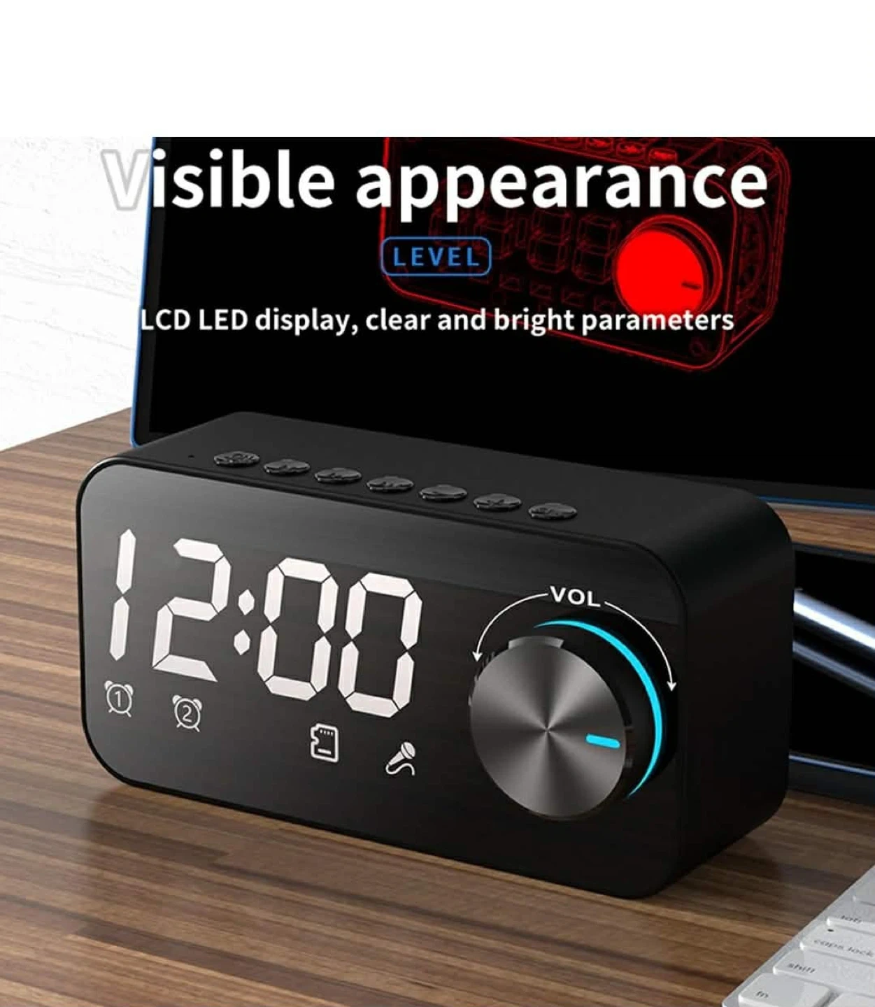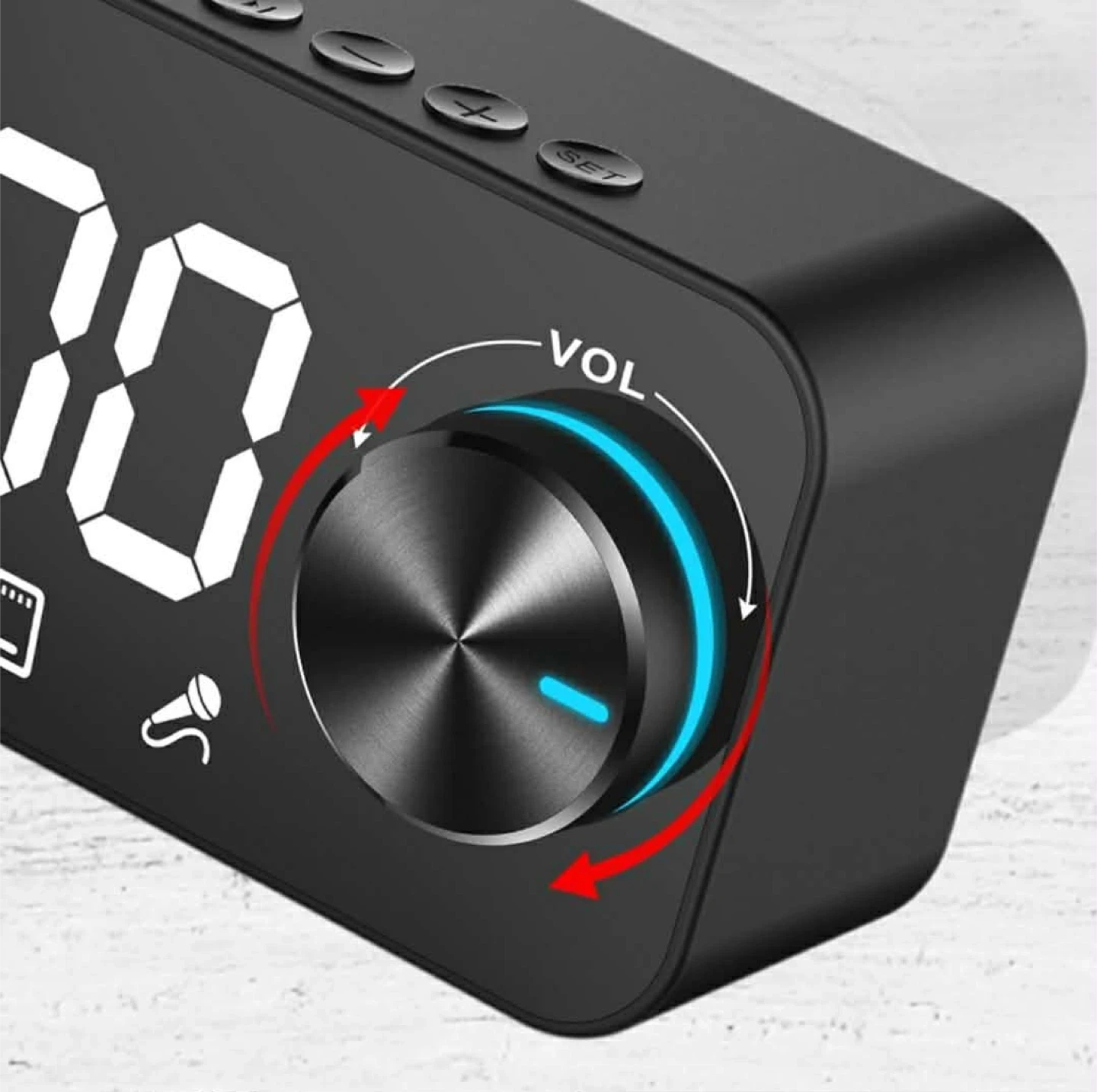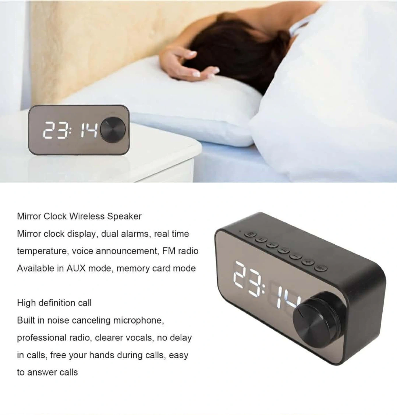 This is a mirror clock wireless speaker. It features a mirror clock display, dual alarms, and real-time temperature. It's available in AUX and memory card modes, and it has a built-in noise-cancelling microphone for high-definition calls. This speaker is useful for waking up on time and taking calls hands-free.