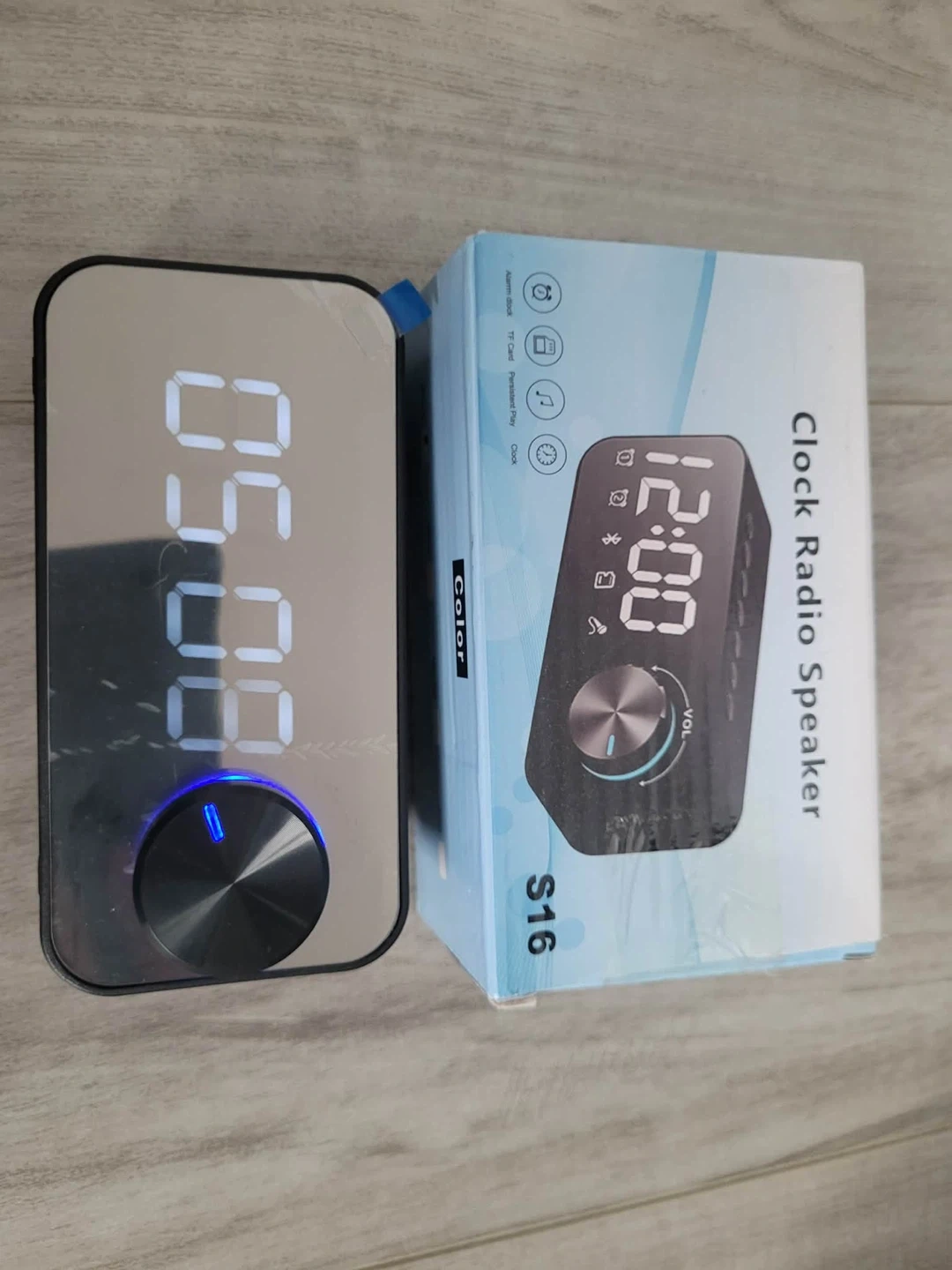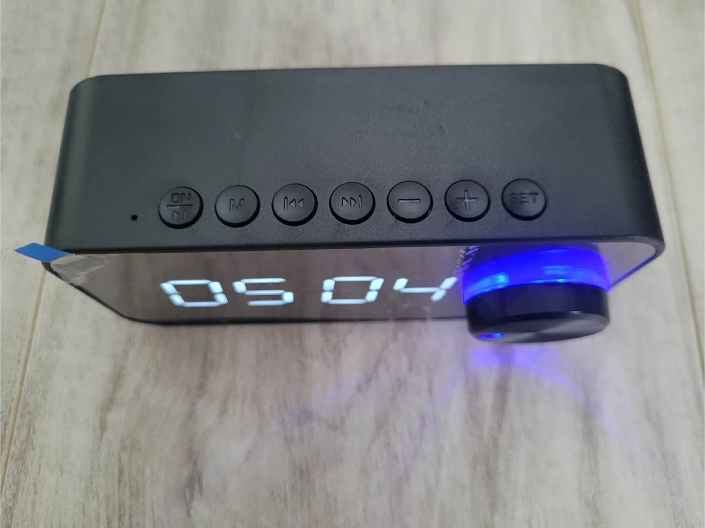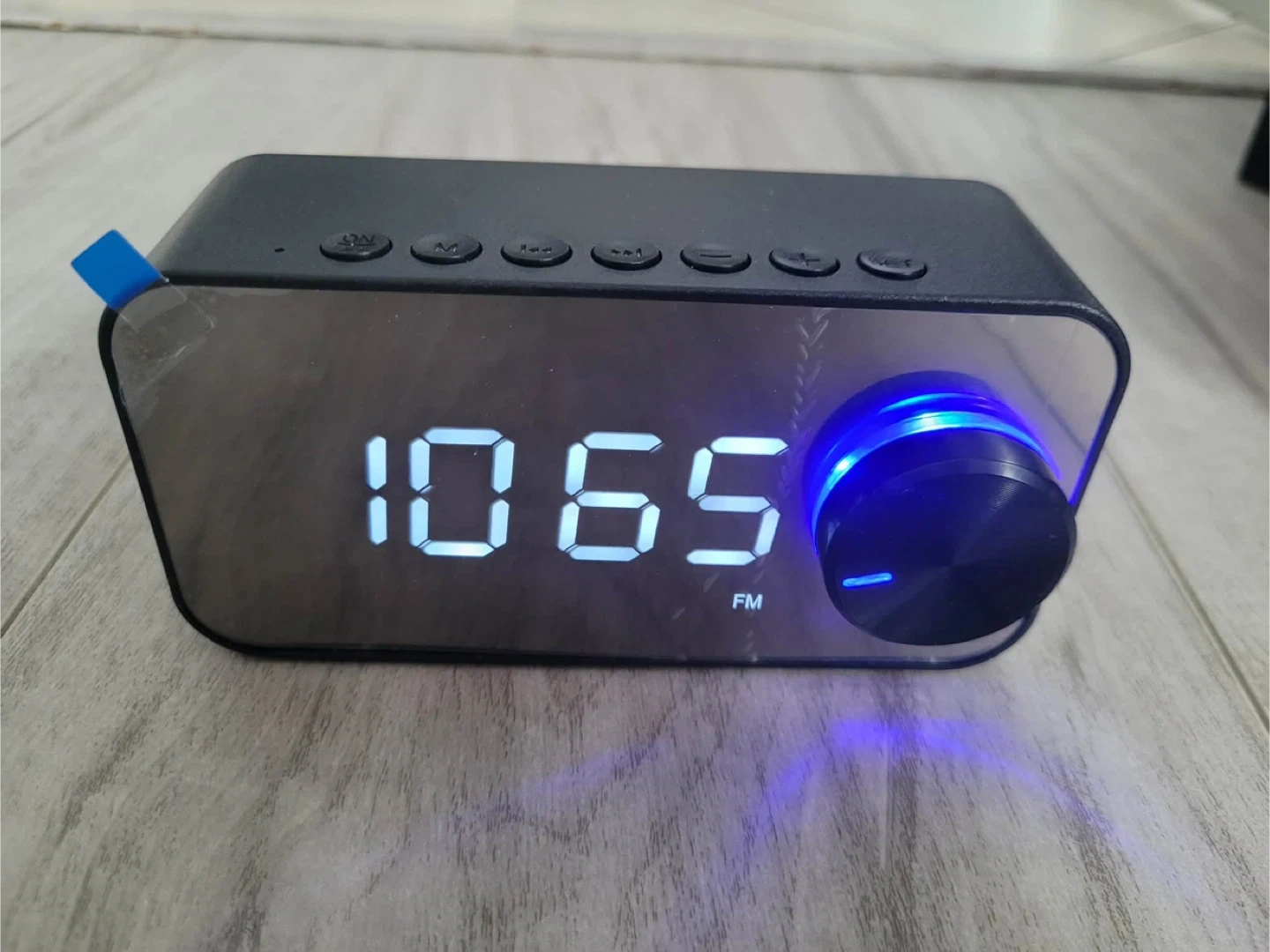 This is a mirror clock wireless speaker. It features a mirror clock display, dual alarms, and real-time temperature. It's available in AUX and memory card modes, and it has a built-in noise-cancelling microphone for high-definition calls. This speaker is useful for waking up on time and taking calls hands-free.
