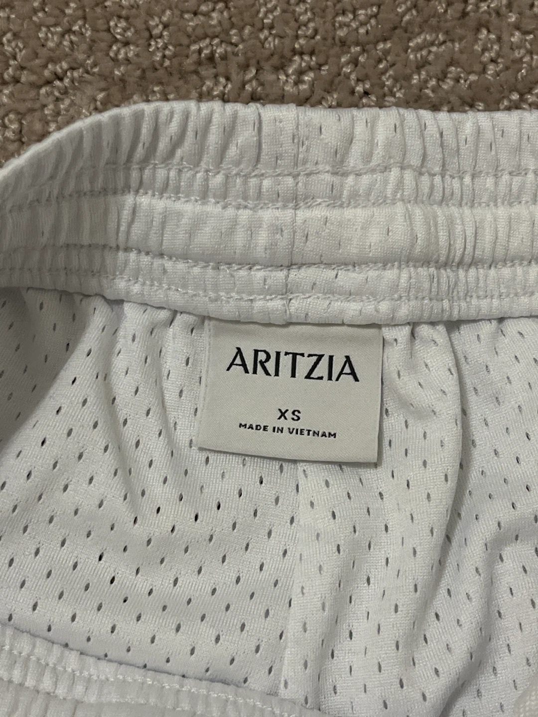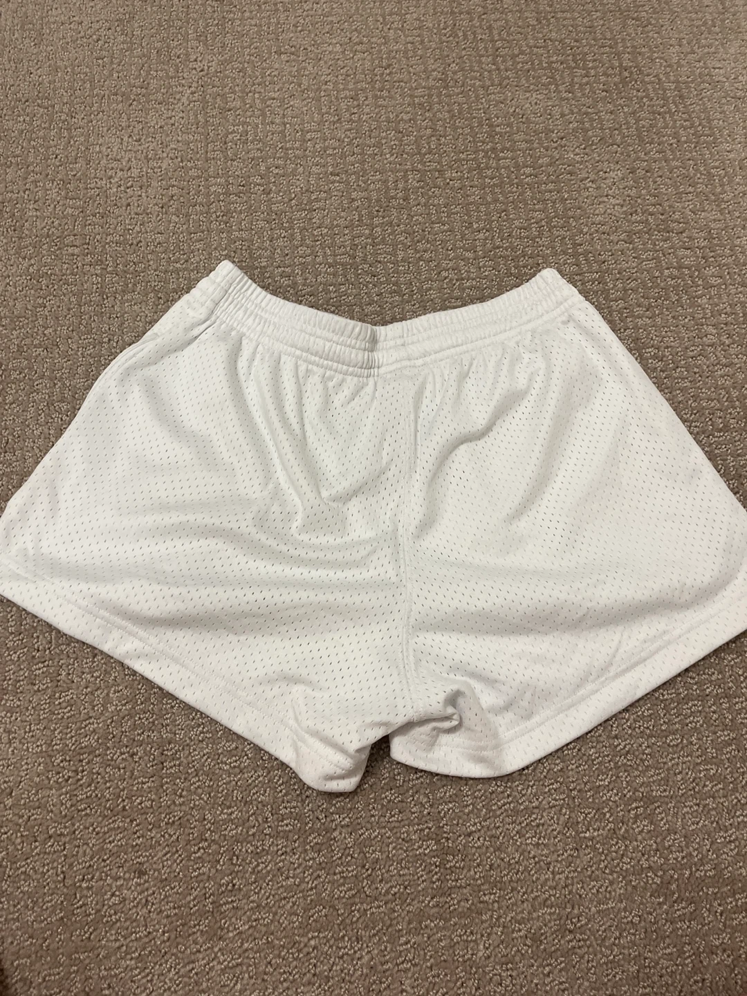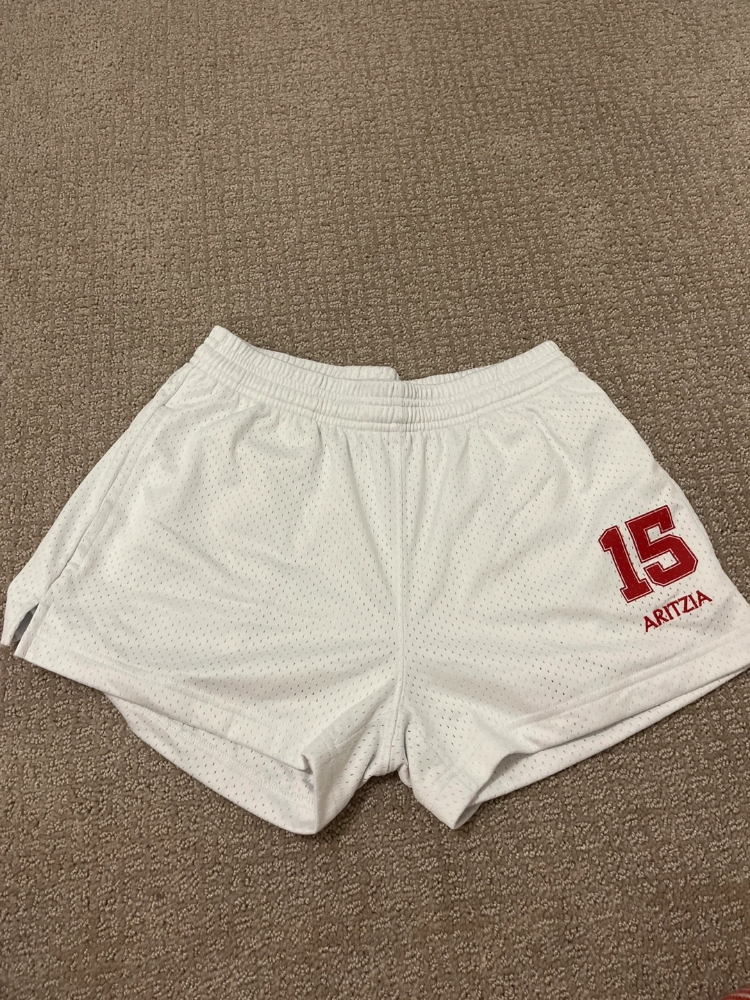 Selling a pair of Aritzia mesh shorts in white! They're a size XS and have the number 15 on them in red. Perfect for a casual, sporty look