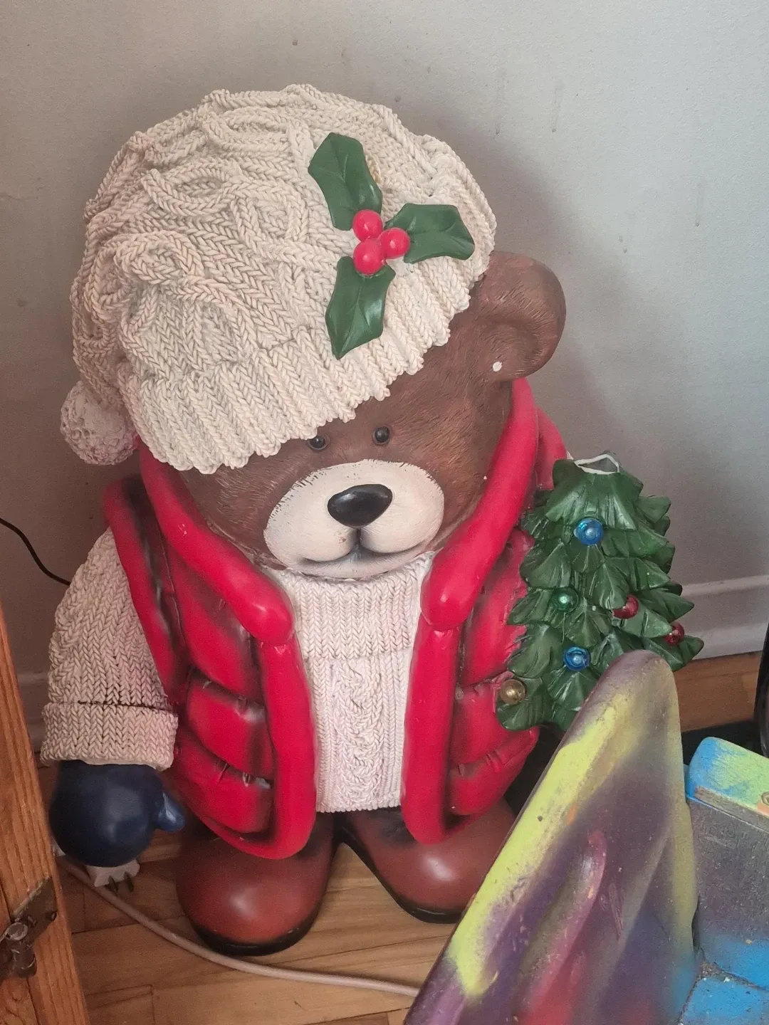 Ornement de teddy bear thématique de Noël. Il porte un bonnet blanc tricoté orné de houx et un manteau rouge sur un chandail blanc. Il tient un petit sapin de Noël décoré. Parfait pour ajouter une touche festive à votre décor des fêtes!