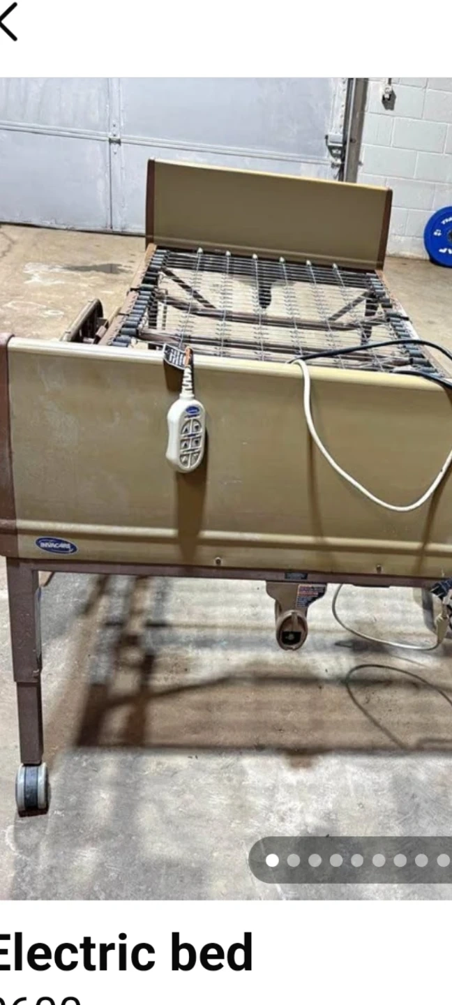 This is an Invacare electric hospital bed. It comes with a Geo-Mattress Ultramax. The bed is adjustable with a hand controller. It has wheels for easy movement.