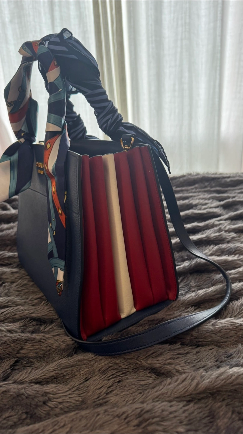 Gorgeous navy blue leather handbag. Features a colourful silk scarf, long shoulder strap, and gold hardware. Excellent condition.