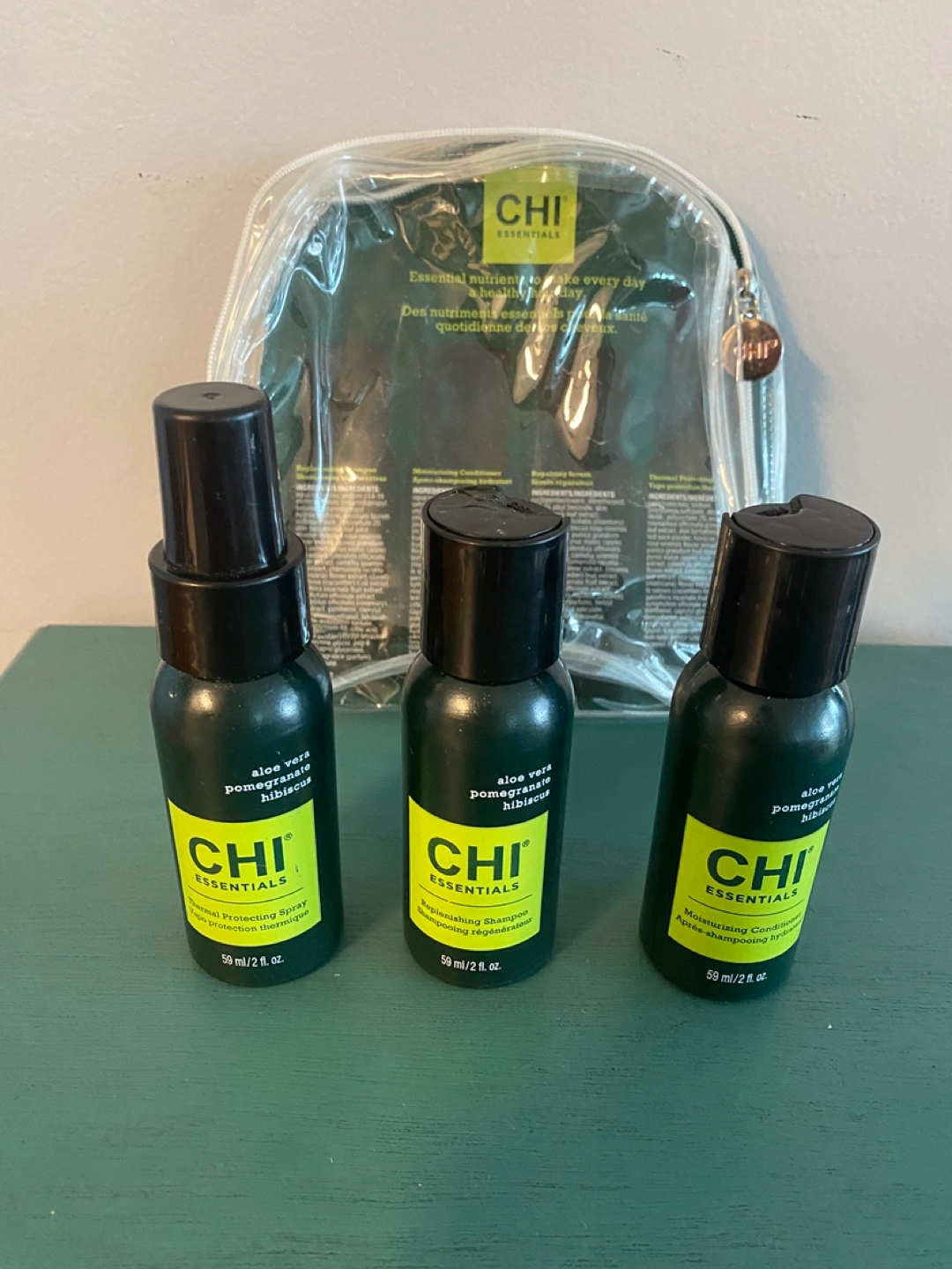 Selling a CHI Essentials travel set! Includes a replenishing shampoo, moisturizing conditioner, and thermal protecting spray. Each bottle contains 59ml/2 fl oz. Perfect for travel or trying out the CHI line!