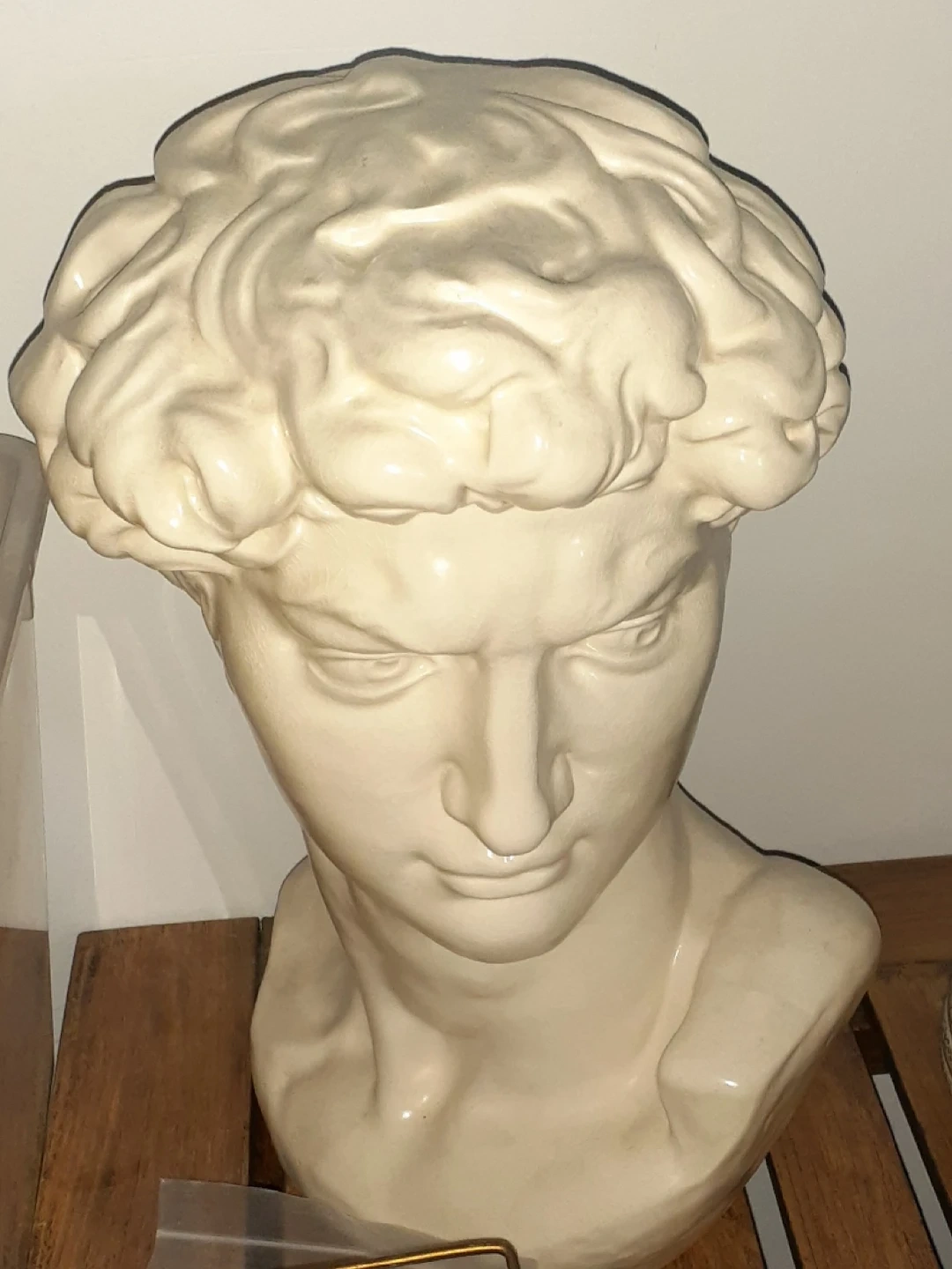 A decorative white ceramic bust of David. This piece has intricate detailing on the hair and facial features. It's a classic statement piece for any home.16 ".no flaws.