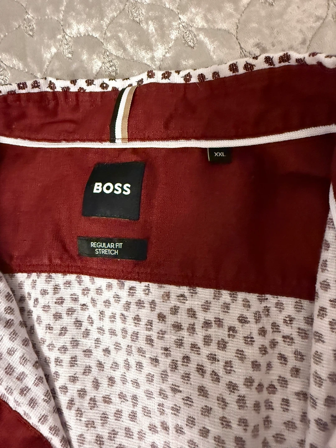 Men’s BOSS short-sleeve shirt in excellent condition. Regular fit. Lightweight linen blend, breathable and comfortable — perfect for summer. White base with small burgundy pattern and contrast inner collar detail. Original BOSS quality. No stains or damage.