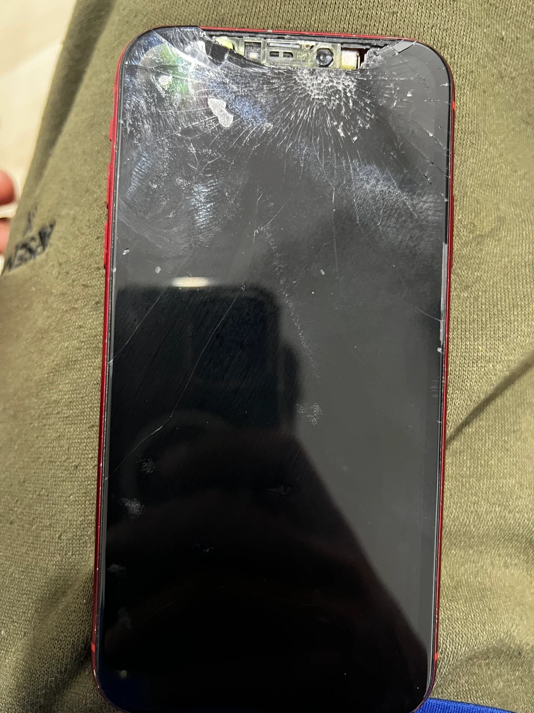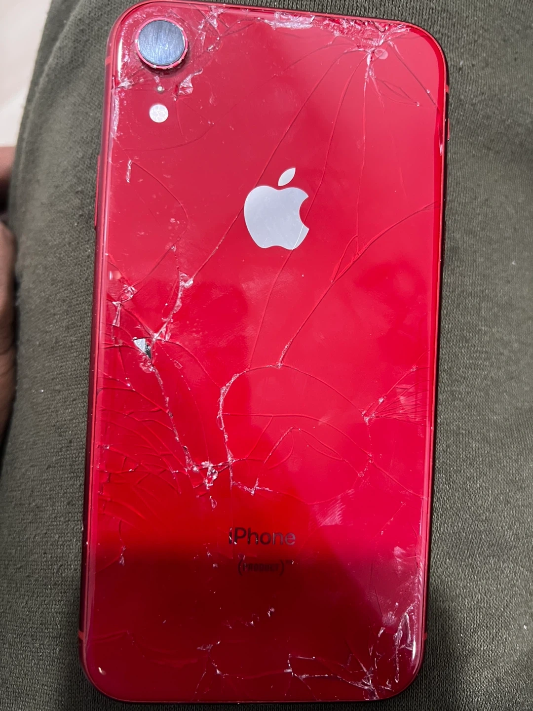This is a red iPhone (Product) with significant cracks on the back and front screens. It's a red coloured device. It is being sold as-is due to the damage.