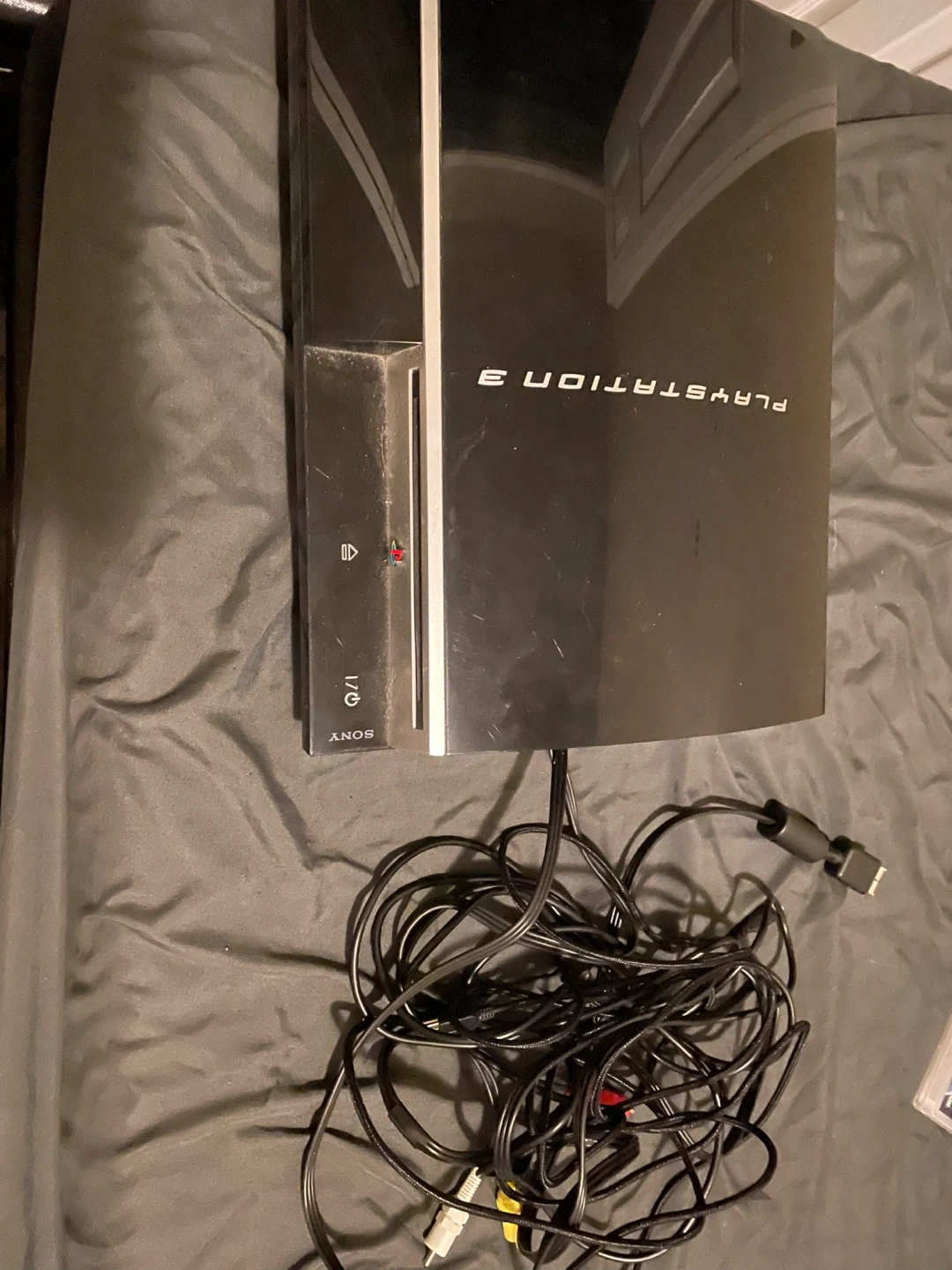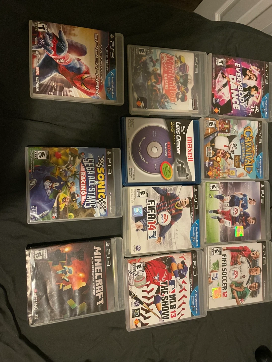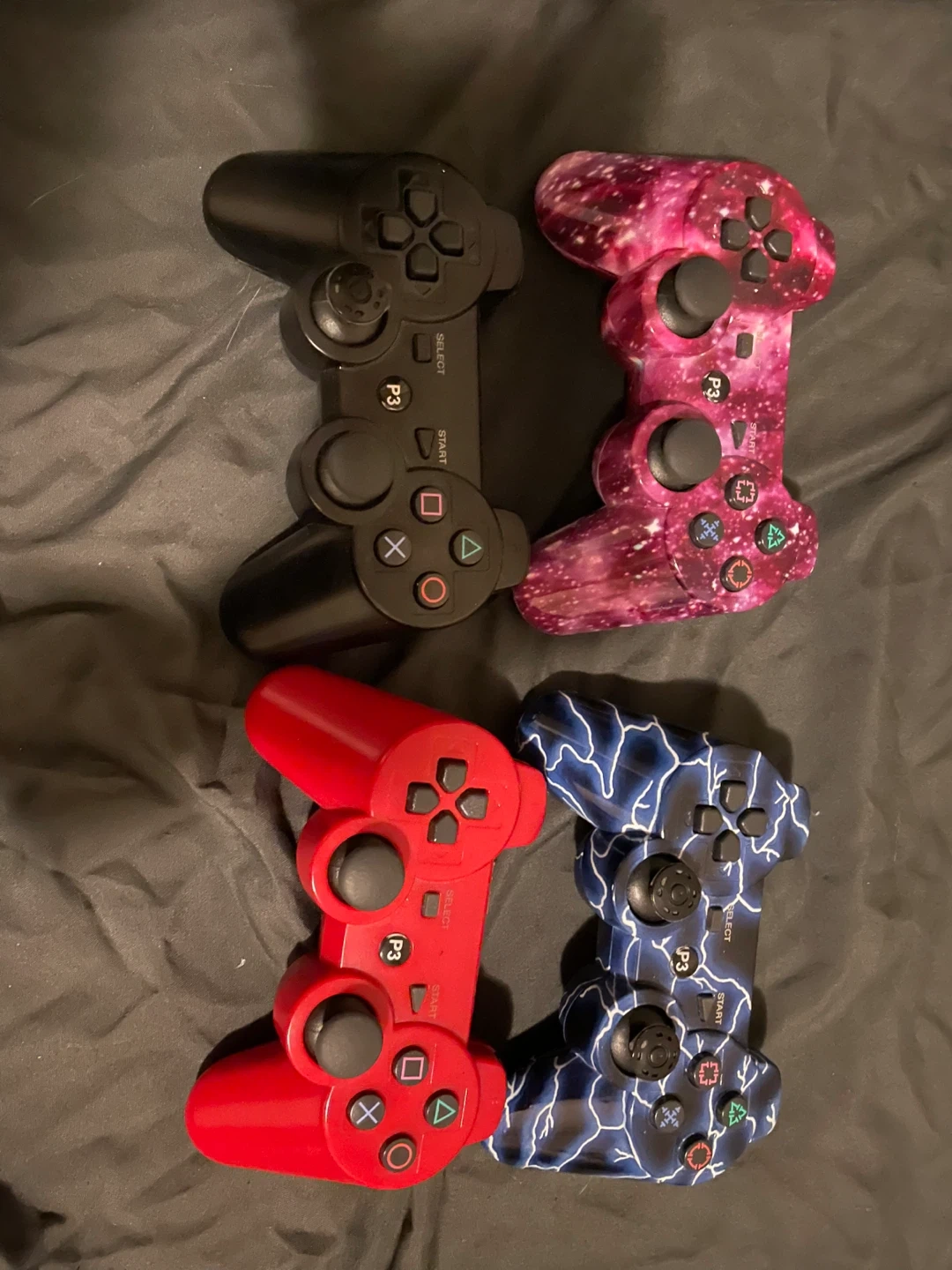 This listing includes a Sony PlayStation 3 console with its power cord and AV cables. Also included are four controllers in various colours and designs: black, pink galaxy, red, and blue lightning. A collection of PS3 games is also part of the bundle, featuring titles like Spider-Man, Sonic All-Stars Racing, Minecraft, FIFA series, and more. This console bundle offers a great gaming experience for PlayStation enthusiasts.