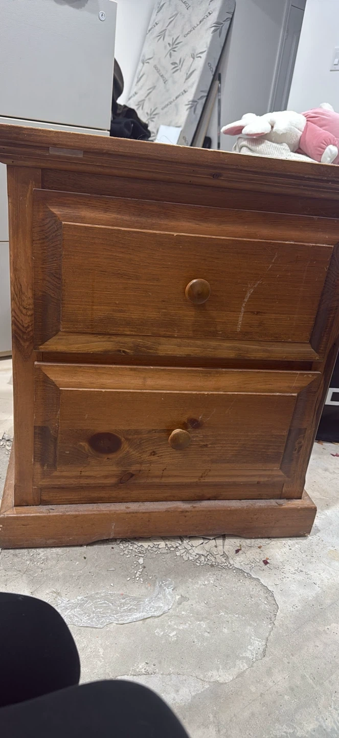 A solid wood nightstand featuring two drawers. It's a classic piece with a warm wood tone. Great for a bedroom or as extra storage.