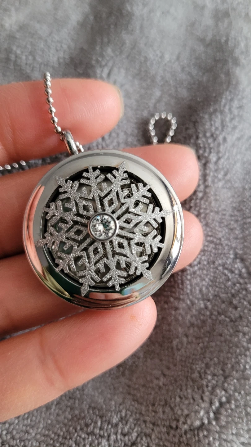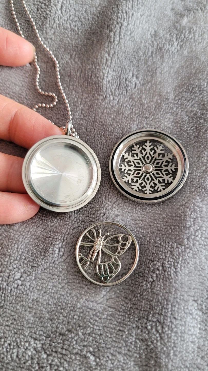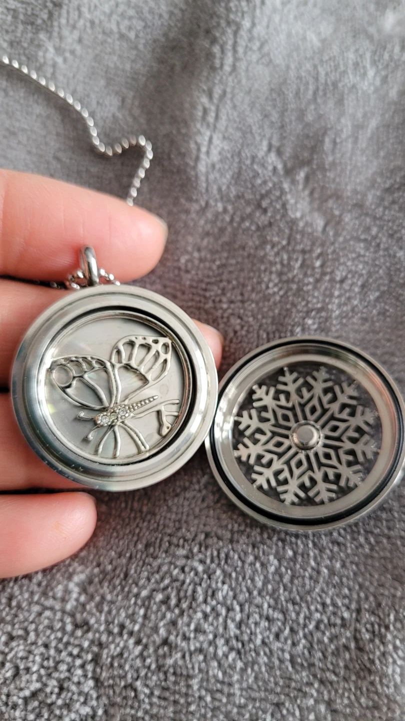This Origami Owl locket necklace features a silver chain and a round locket with a snowflake design. It opens to reveal a space for charms or photos. Includes a butterfly charm and a snowflake insert.