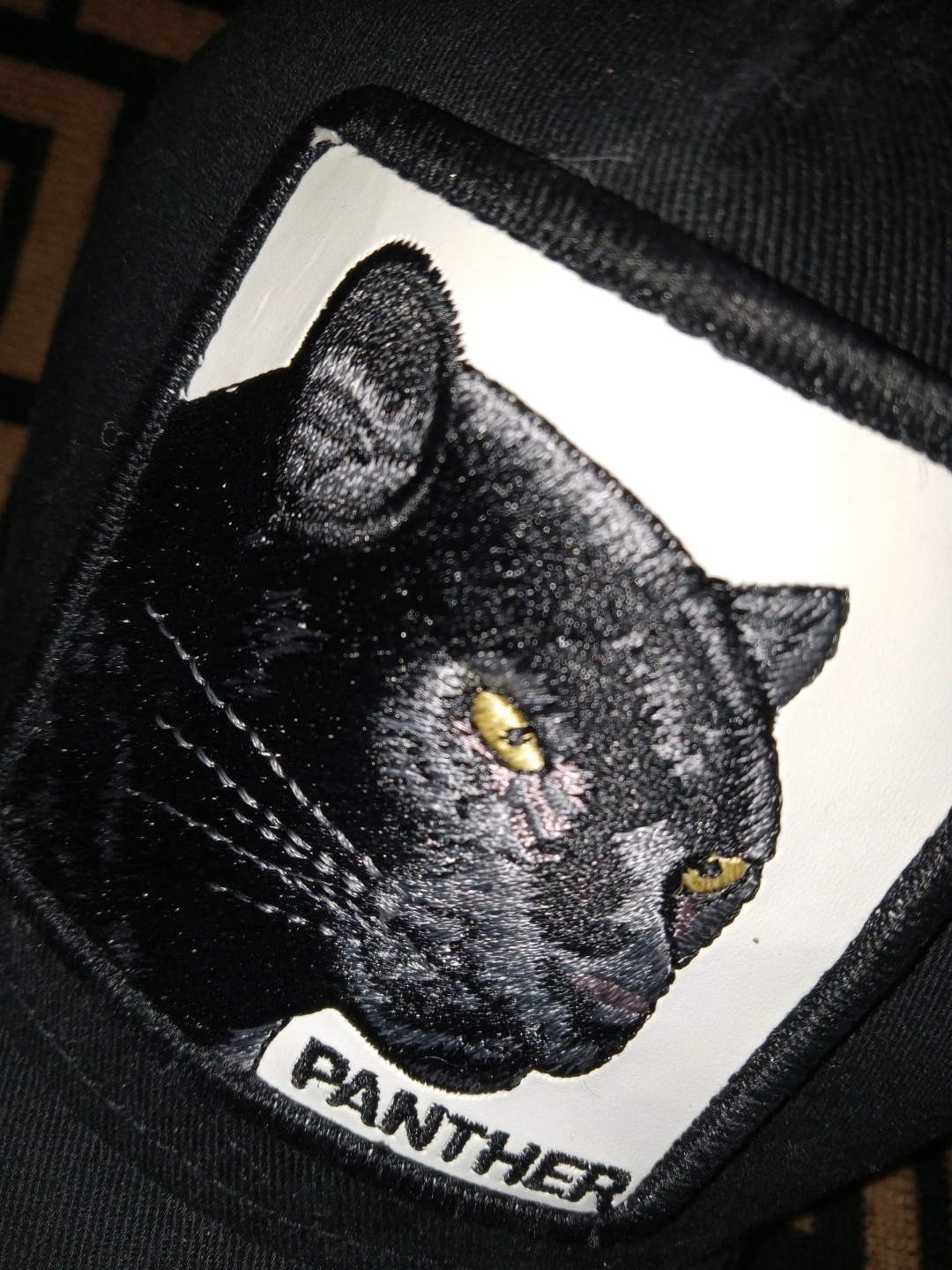 Black Goorin Bros The Farm hat with a panther graphic patch. It's a snapback style with mesh back panels.