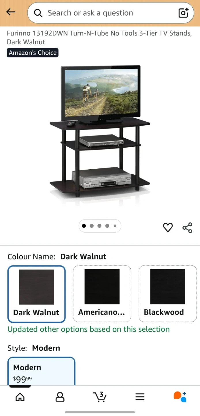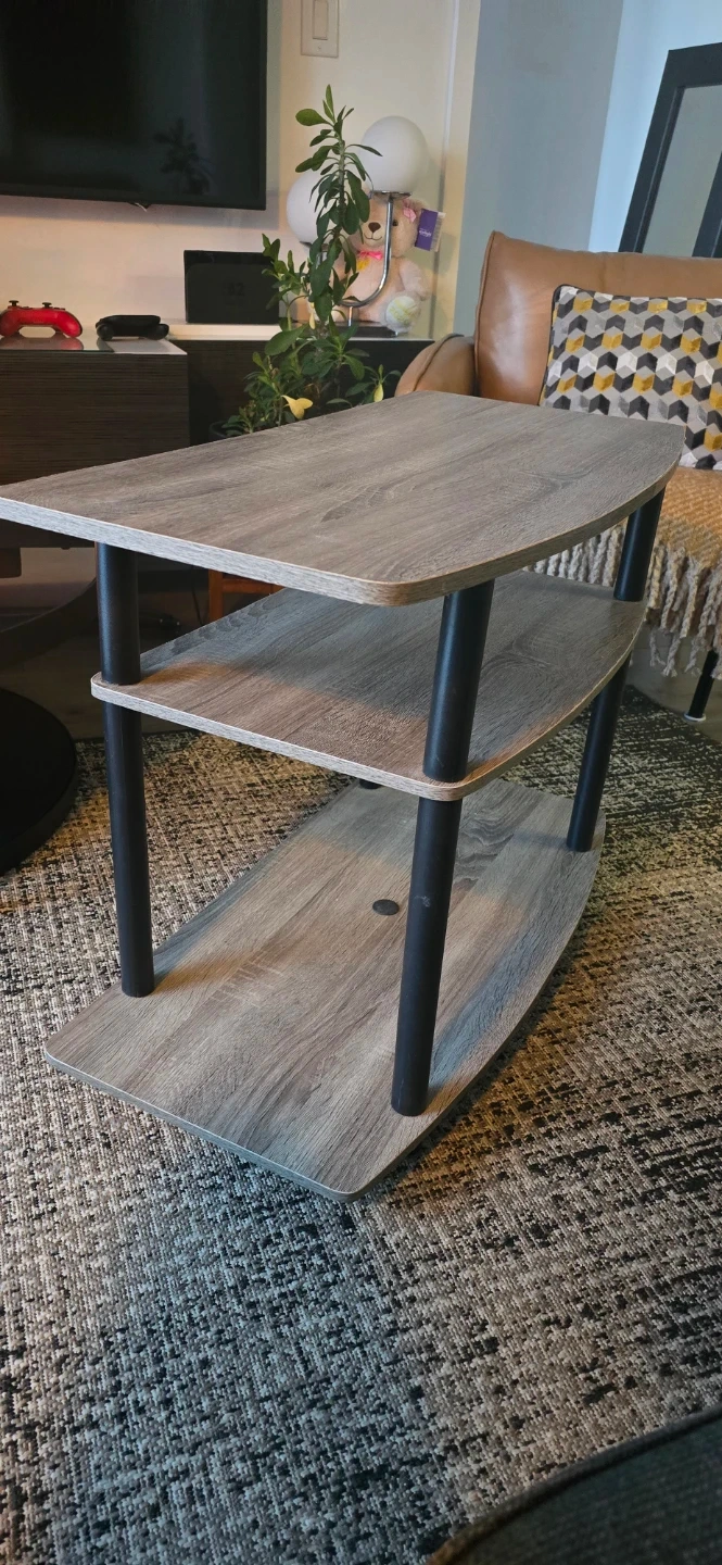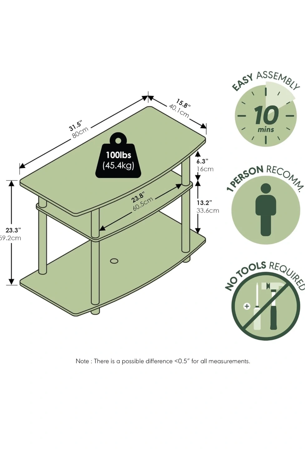 This is a Furinno 3-tier TV stand with a gray oak finish. It's designed with no tools required for assembly. The stand measures 31.5 inches wide and has a weight capacity of 100lbs. It's a great addition for organizing your media devices.