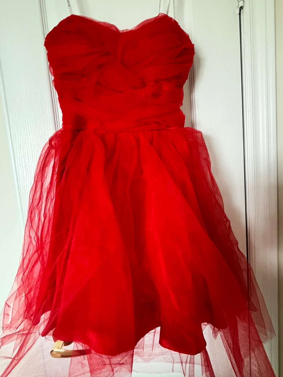 Sweetheart neckline strapless dress. It's a beautiful red colour with a layered tulle skirt. Features a back zipper closure. Size 3/4