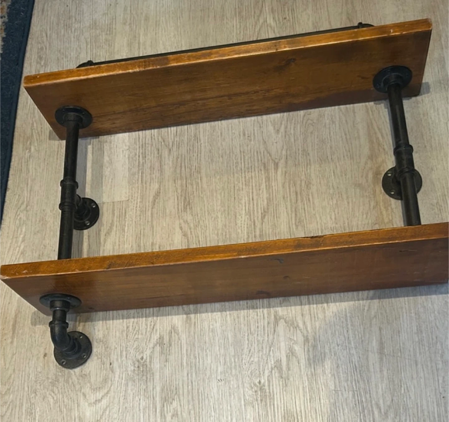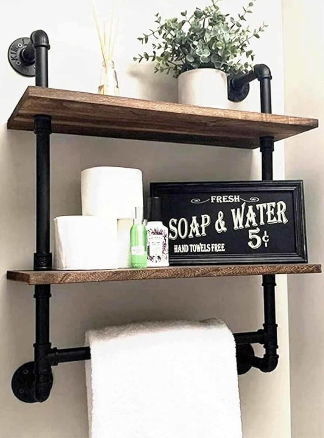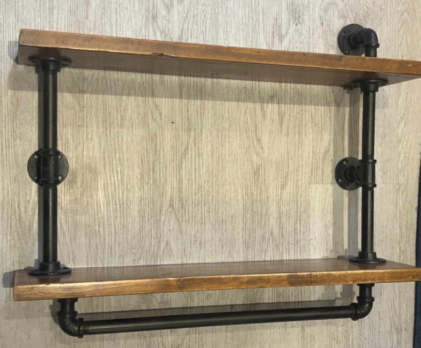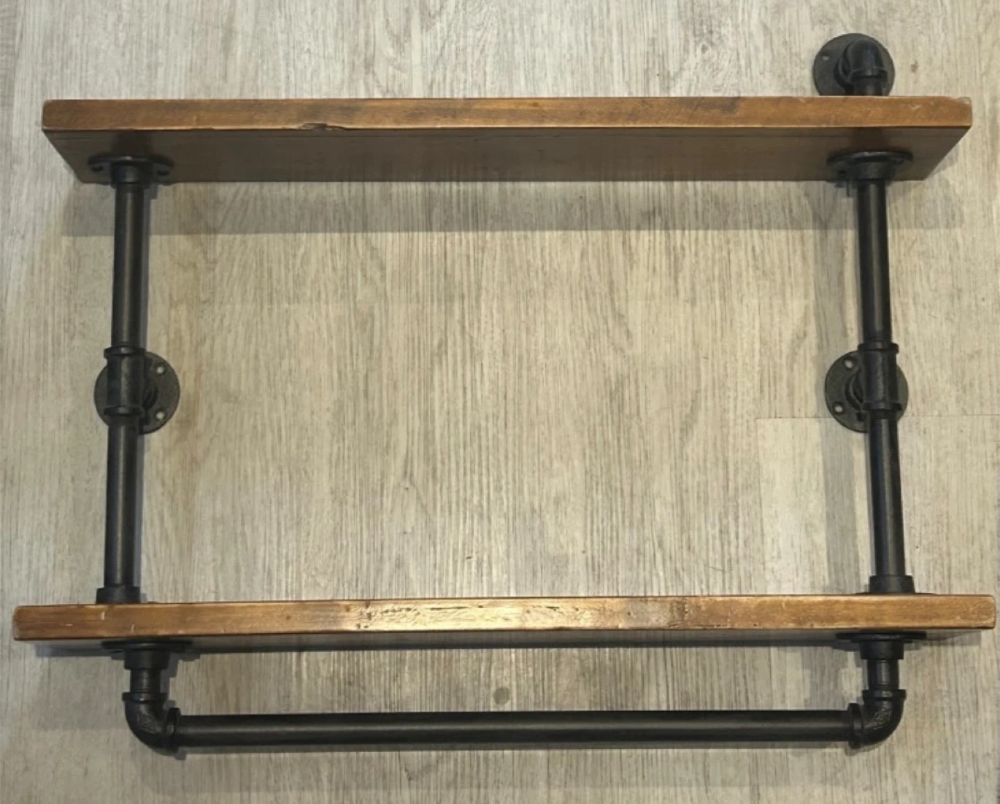 This two-tiered industrial pipe shelf features a rustic wood finish and a black metal pipe frame. It includes a convenient towel bar below the bottom shelf, perfect for bathrooms or kitchens. The design is sturdy and functional.