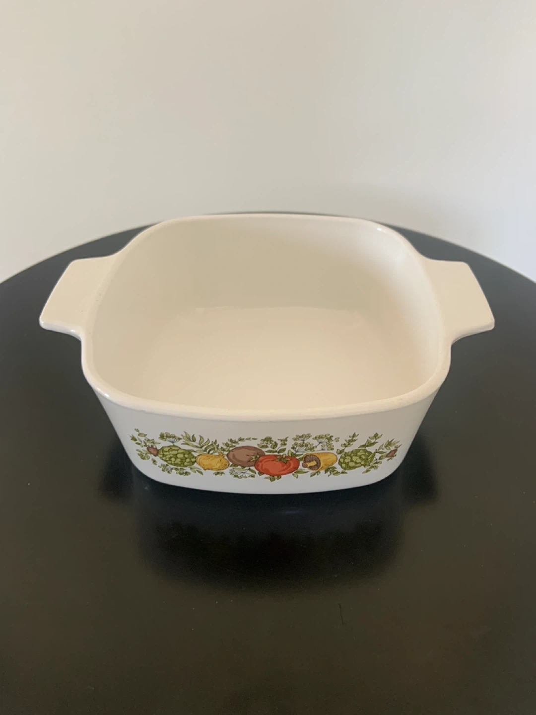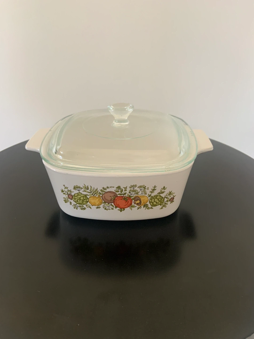 Selling a vintage Corelle casserole dish with a lid. It features a charming vegetable pattern around the rim. Perfect for baking or serving your favourite dishes!