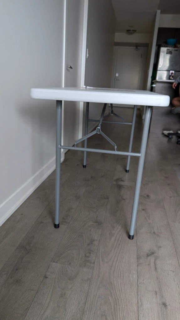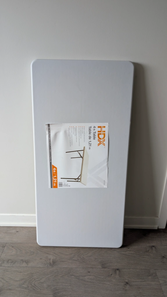 White folding table, 4 feet long. Sturdy steel frame. it's new..just used it for 4 days . it's sturdy, can hold weights up to 50 kgs. folding table, can be used for small spaces as well .
