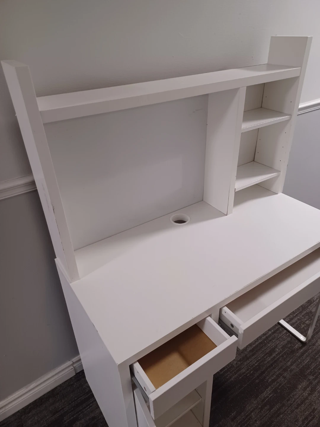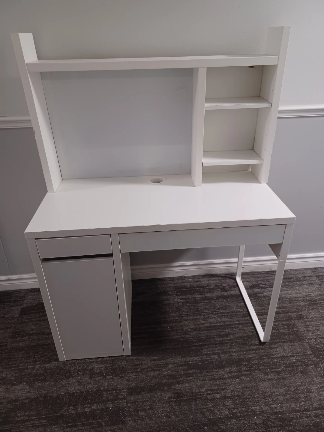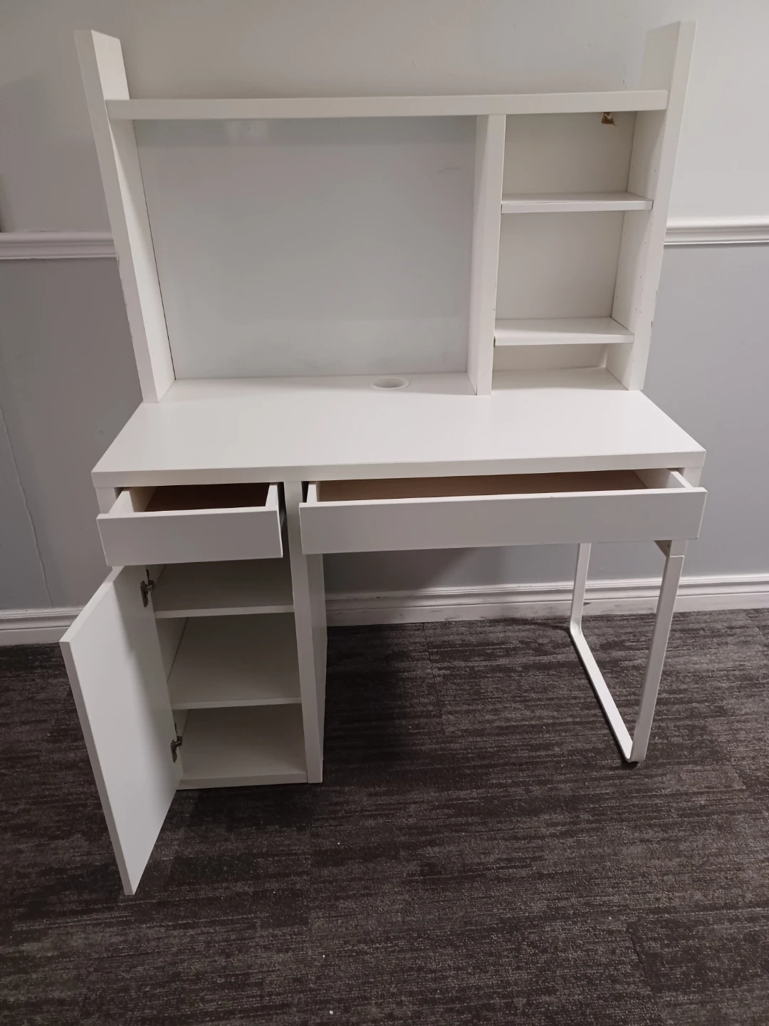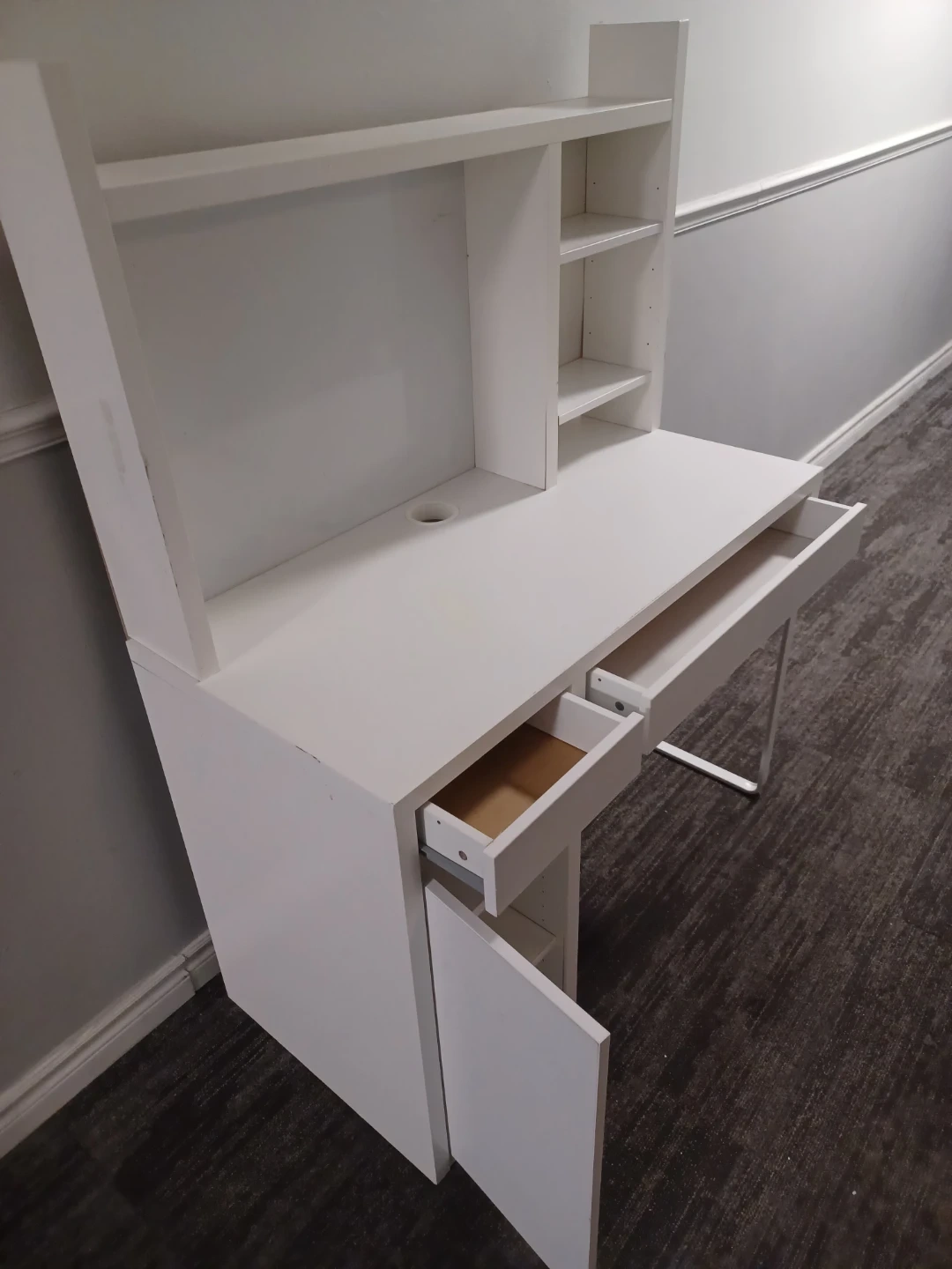 White computer desk with a hutch for storage. It includes one drawer and a cabinet with shelving. The desk also features an open shelf above the main surface and additional shelving on the right side of the hutch. There's a cable management hole on the desk surface. This desk is suitable for a home office or student setup.