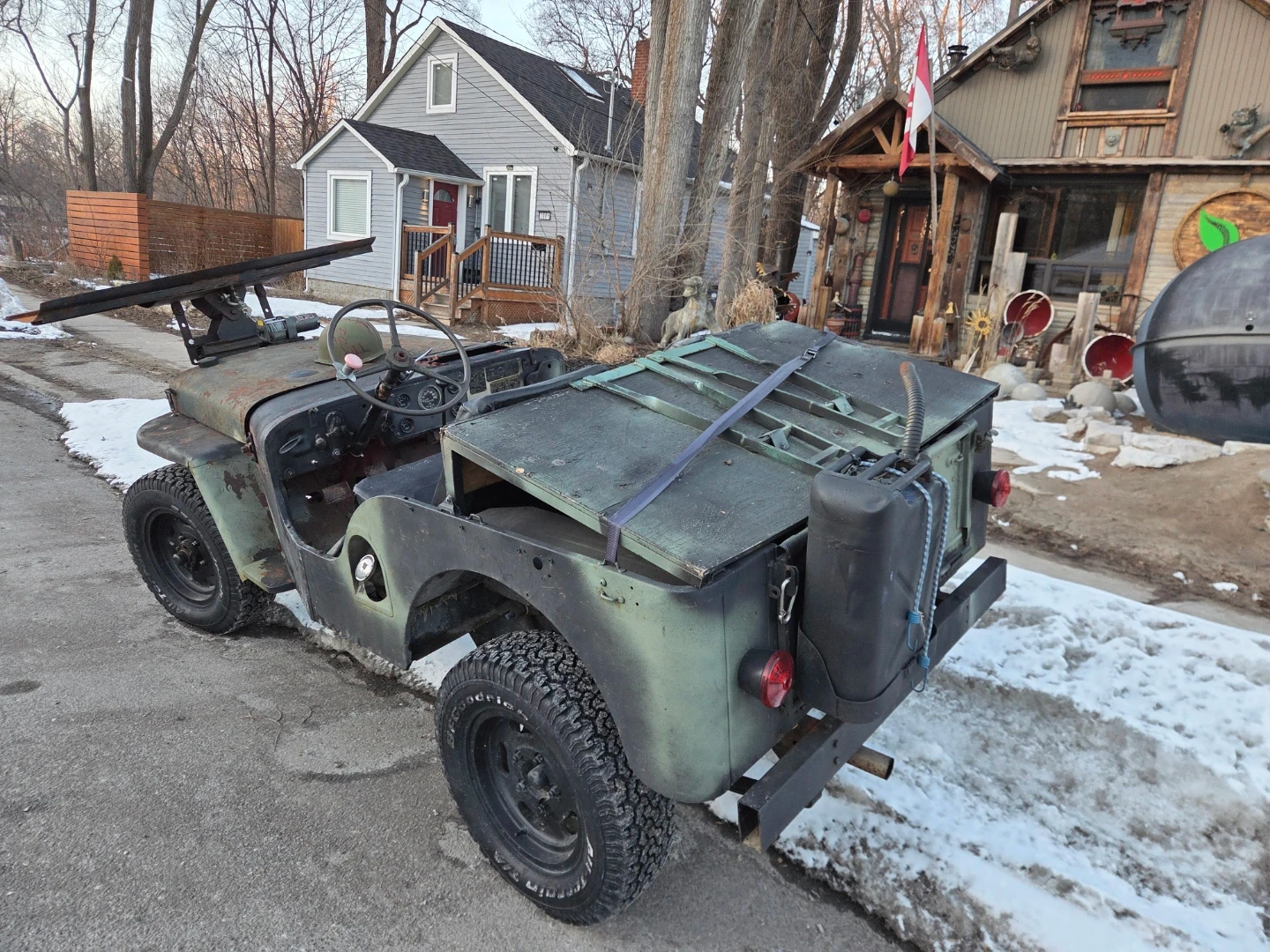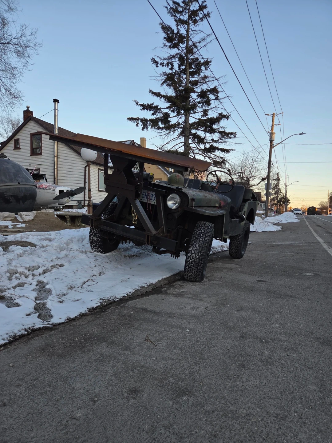 Customized Jeep with a front-mounted snow plow and a rear rack system. It's painted in a camouflage pattern and has off-road tires. Includes a spare fuel can mounted on the back. Plated Insured ontario 1952 m38. 11000$